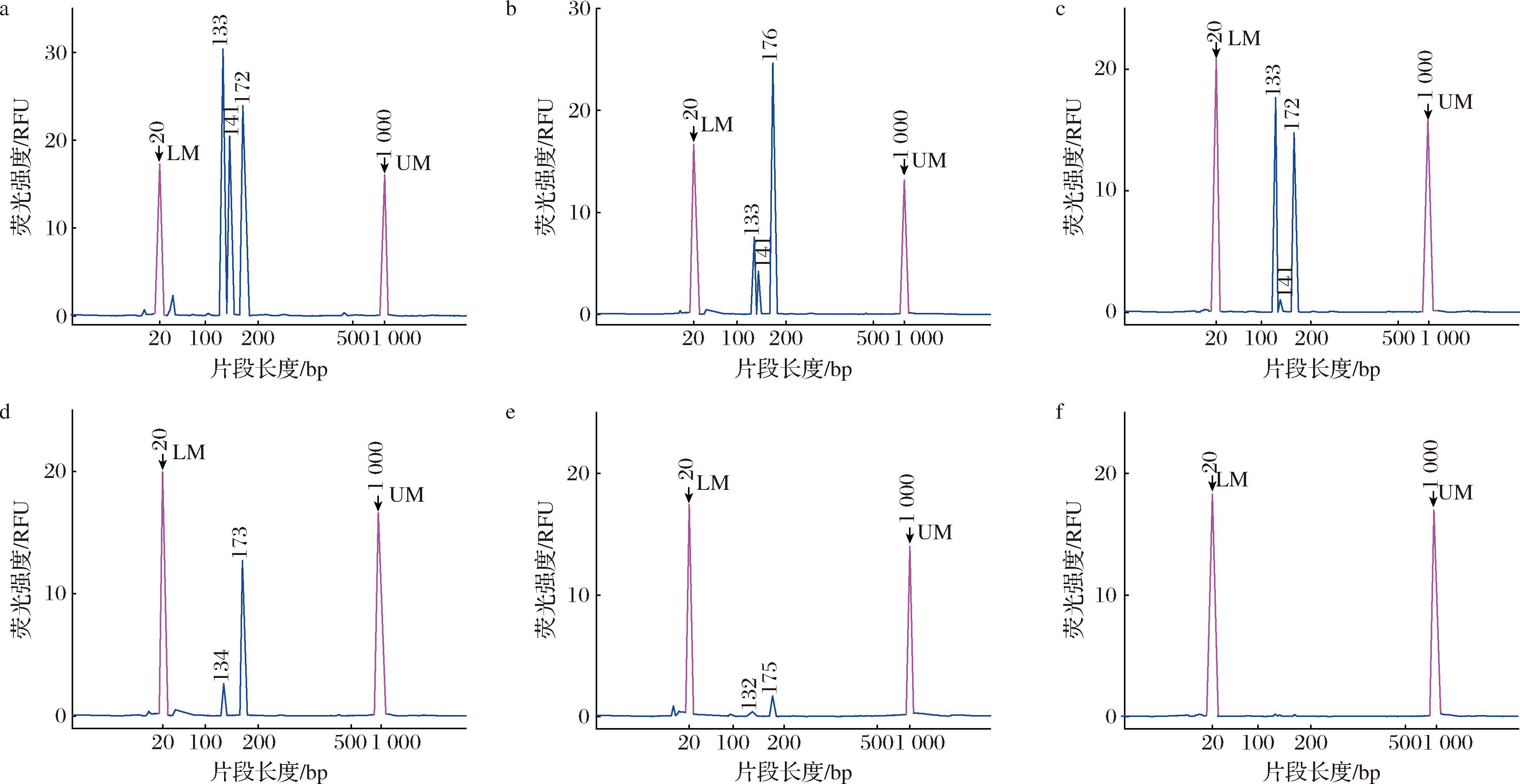 干扰DNA(单增李斯特氏菌、副溶血性弧菌、蜡样芽孢杆菌)和混合DNA(目标菌+干扰菌)的检测结果如图5所示。由图5可知,干扰DNA无目标片段峰,混合DNA仅出现133、141、170 bp峰,表明该方法可特异性检测大肠埃希氏菌、鼠伤寒沙门氏菌和金黄色葡萄球菌,不受非目标菌干扰,具有优异特异性。