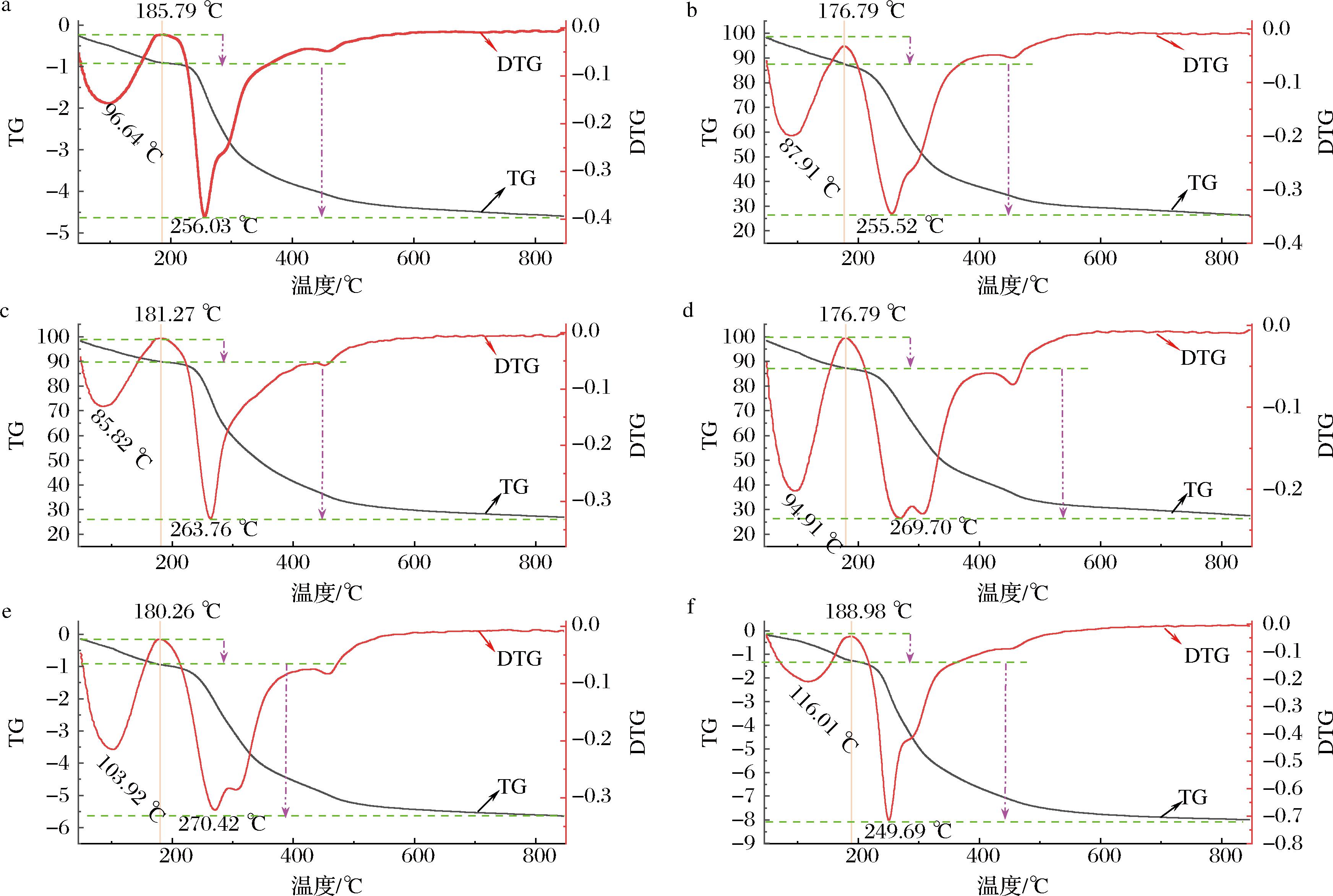 6种不同提取方法所得的BDPs样品在第三阶段发生热解的温度范围分别是284.56~617.74 ℃、176.70~845.76 ℃、181.27~845.99 ℃、179.08~845.97 ℃、180.94~845.84 ℃、188.98~845.69 ℃。在高温阶段,6种不同提取方法所得的BDPs样品的DTG曲线无明显峰值,说明样品的剩余质量基本稳定,质量损失较少,不同的提取方法对BSPs的热稳定性影响不显著。