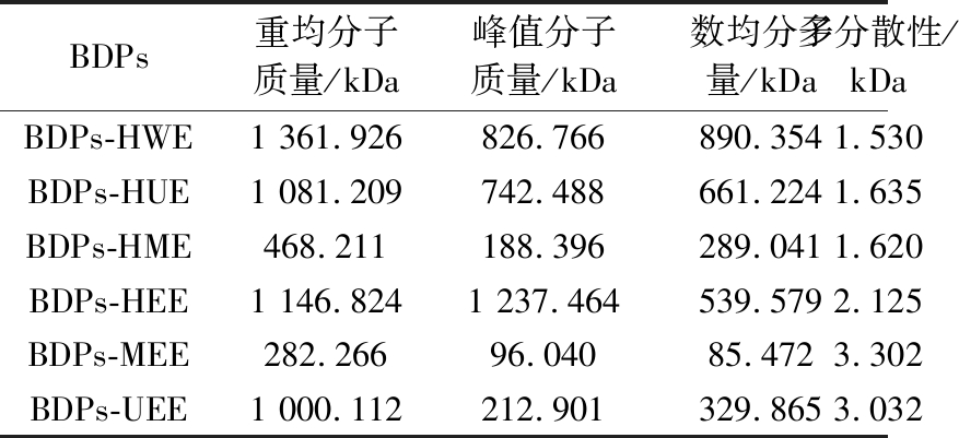 由图1和表3可知,BDPs的分子质量受不同提取方法的影响较大。6种提取方法中,BDPs-HWE的重均分子质量最高,为1 361.926 kDa;BDPs-MEE的重均分子质量最低,为282.266 kDa。BDPs-HEE的峰值分子质量最大,为1 237.464 kDa;BDPs-MEE的峰值分子质量最小,仅96.04 kDa。BDPs-HWE的数均分子质量为890.354 kDa,在6种提取方法中相对较高;BDPs-MEE的数均分子质量最低,为85.472 kDa。此结果可能是由于普通的热水浸提因其较高的温度和较长时间的处理导致提取制备的多糖分子之间容易出现聚集现象,导致分子质量较大。