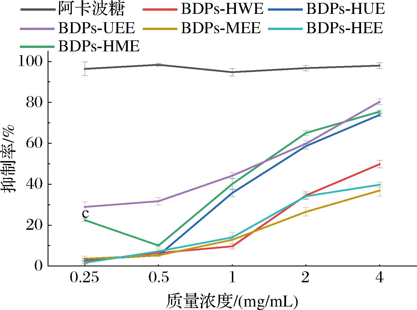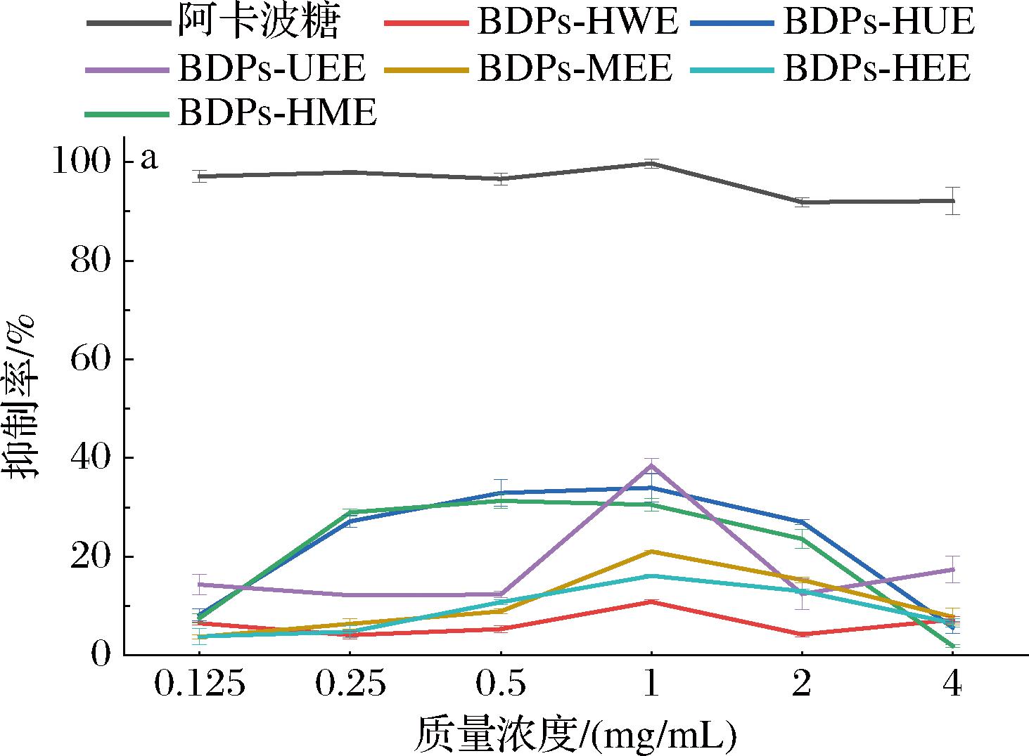 由图11可知,不同提取方法所得BDPs对α-淀粉酶存在明显抑制,整体呈现先升后降的趋势。在质量浓度处于0.125~1 mg/mL时,多糖对α-淀粉酶的抑制率呈现出随浓度升高而逐步增强的趋势。具体而言,当多糖质量浓度达到1 mg/mL时,抑制率达到峰值,其中运用超声辅助酶法提取的BDPs对α-淀粉酶的抑制率可达48.66%。随后,当质量浓度增加到1~4 mg/mL时,随着浓度的持续递增,多糖对α-淀粉酶的抑制率却转为逐渐下降的趋势。因此,判断抑制α-淀粉酶的最优多糖质量浓度为1 mg/mL。在此浓度下,BDPs-UEE抑制率最高,其次为BDPs-HUE和BDPs-HME,这三者之间差异不显著(P>0.05),且抑制率明显低于阳性对照阿卡波糖的抑制率(P<0.05),BDPs-MEE、BDPs-HEE和BDPs-HWE的抑制率依次减小,三者间差异不显著(P>0.05)。因此,采用超声并加以酶辅助提取所得多糖其降血糖效果较优。有研究表明,多糖的降血糖活性与多糖分子质量大小和单糖组成的复杂程度有着直接关系,多糖能够发挥最佳生物活性的前提是它的相对分子质量在合适的范围内,单糖组成种类越多会使得多糖具有更高降血糖活性[35],这也可能是BDPs-UEE拥有较高的降血糖活性的原因之一。