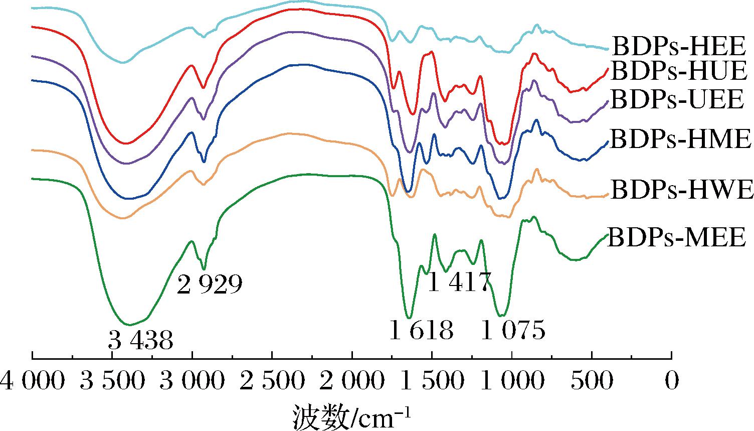 1.3.3.4 不同提取方法制备BDPs红外光谱分析(Fourier transform infrared spectroscopy,FT-IR)