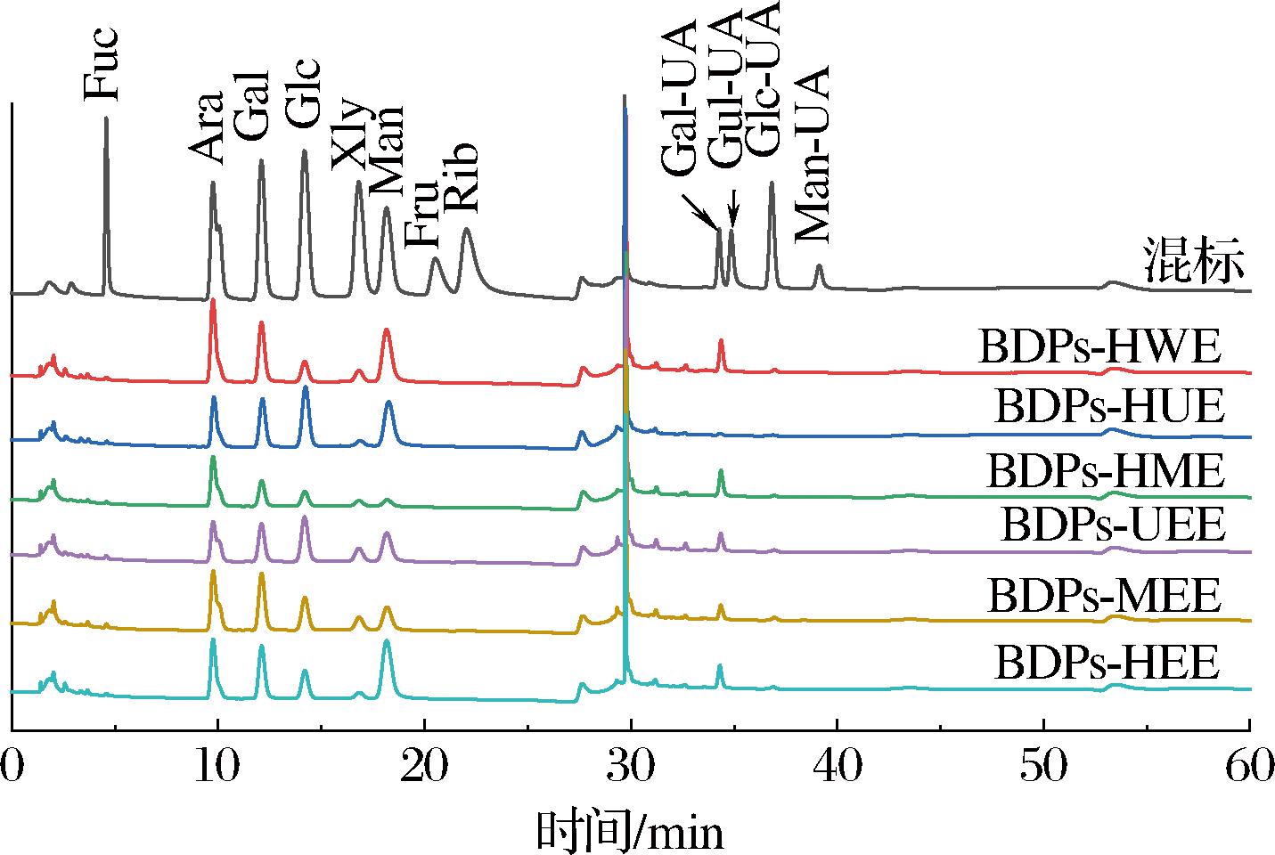 检测BDPs单糖组成时,使用Thermo IC5000离子色谱系统,电化学检测器进行分析。图2所示的BDPs单糖组成离子色谱图中共有峰含有8种,分别是岩藻糖、阿拉伯糖、半乳糖、葡萄糖、木糖、甘露糖、半乳糖醛酸、葡萄糖醛酸。其中BDPs-HUE单糖组成中相比其他样品多含有古罗糖醛酸,这可能是因为超声辅助条件下,空化效应优先断裂连接古罗糖醛酸的糖苷键,释放出游离的Gul-A或其寡糖片段。而其他提取方法的剪切力较弱,可能无法有效破坏这些键。因此不同提取方法BDPs中多糖组成存在差异。