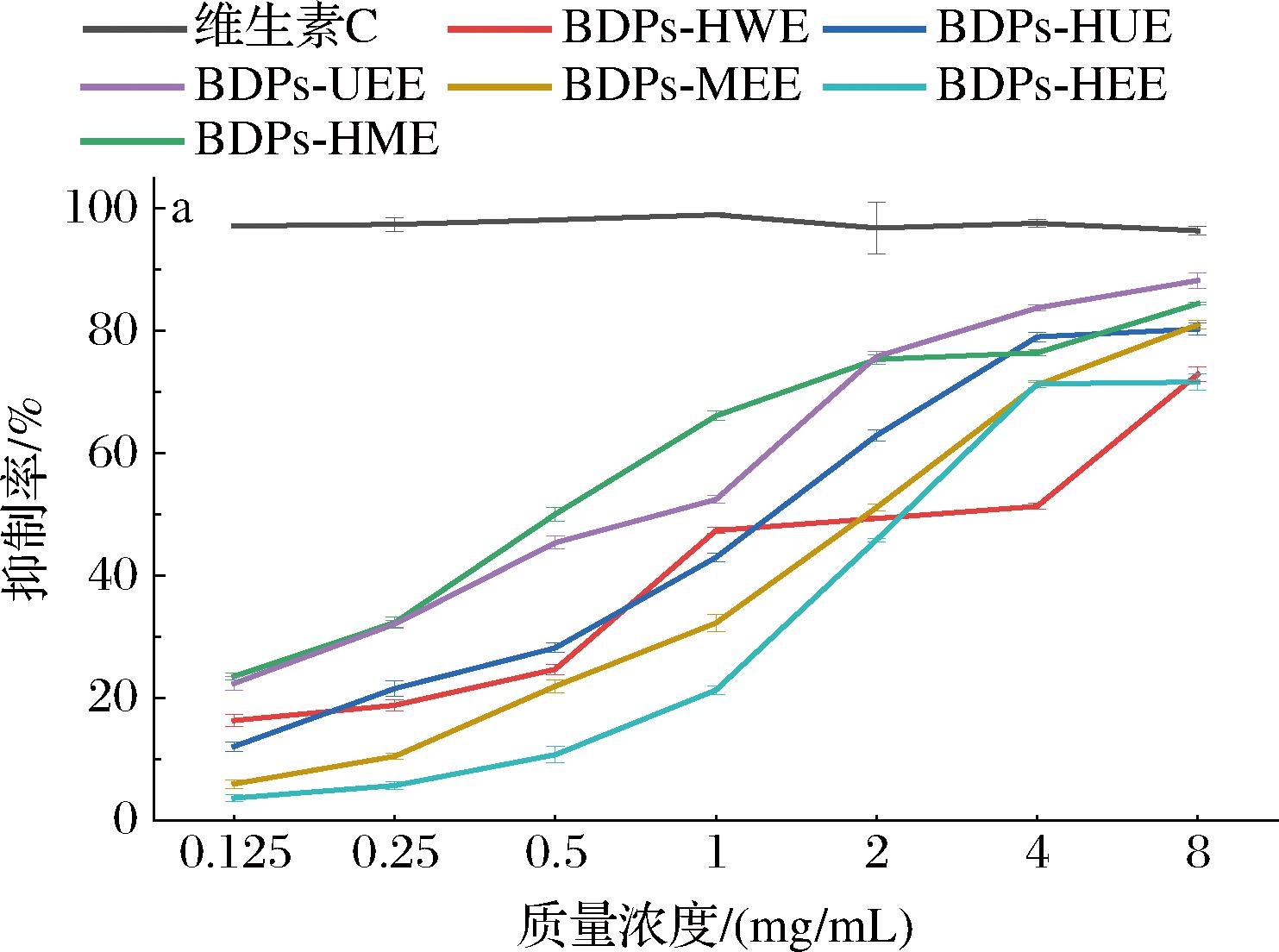 由图8可知,采用6种不同提取方式所得到的BDPs在特定浓度区间内,均展现出对DPPH自由基的有效清除能力。当处于高浓度条件下,即质量浓度达到8 mg/mL时,6种多糖样品对DPPH自由基的清除率均可超过80%,此清除能力与抗坏血酸(维生素C)相近。其中,由超声辅助酶法提取得到的BDPs对DPPH自由基的清除率更是高达89.61%,相较于阳性对照虽略低,但经统计学检验,两者差异无显著性意义(P>0.05),BDPs-UEE在这些多糖样本中展现出最优的抗氧化性能。猜测出现这种结果的潜在原因可能是酶解条件下,反应条件较为温和,且由于超声波辅助提取使多糖与蛋白等杂质的链接键被破坏,多糖结构中暴露出了更多的活性基团,从而提升了粗多糖的纯度和抗氧化能力[29]。许多研究表明,多糖的生物活性与其化学组成和结构特征,包括分子质量(Mw)、单糖组成、糖苷键、链构象等密切相关。JI等[30]对枣果实多糖的结构特征及抗氧化活性比较发现,植物多糖中存在大量半乳糖醛酸可能导致更高水平的DPPH自由基清除率。杨金涛等[31]对榆黄蘑多糖的构效关系研究发现,Ara、Rib、Man和Glc 4种单糖对多糖的抗氧化活性具有积极的促进作用。这与本研究结果中BDPs-UEE的Xyl、Glc、Man、Gal-UA含量相对较高大致吻合。在实验所设定的质量浓度范围(0.125~8 mg/mL)内,不同提取方法制备的多糖样品对DPPH自由基的清除率呈现出剂量依赖性变化,整体而言,它们的抗氧化效果均低于维生素C。猜测可能是因为不同提取方法对多糖中杂质的去除程度不同,某些杂质可能会与自由基反应,或者干扰多糖与自由基的结合,从而影响多糖的抗氧化活性。