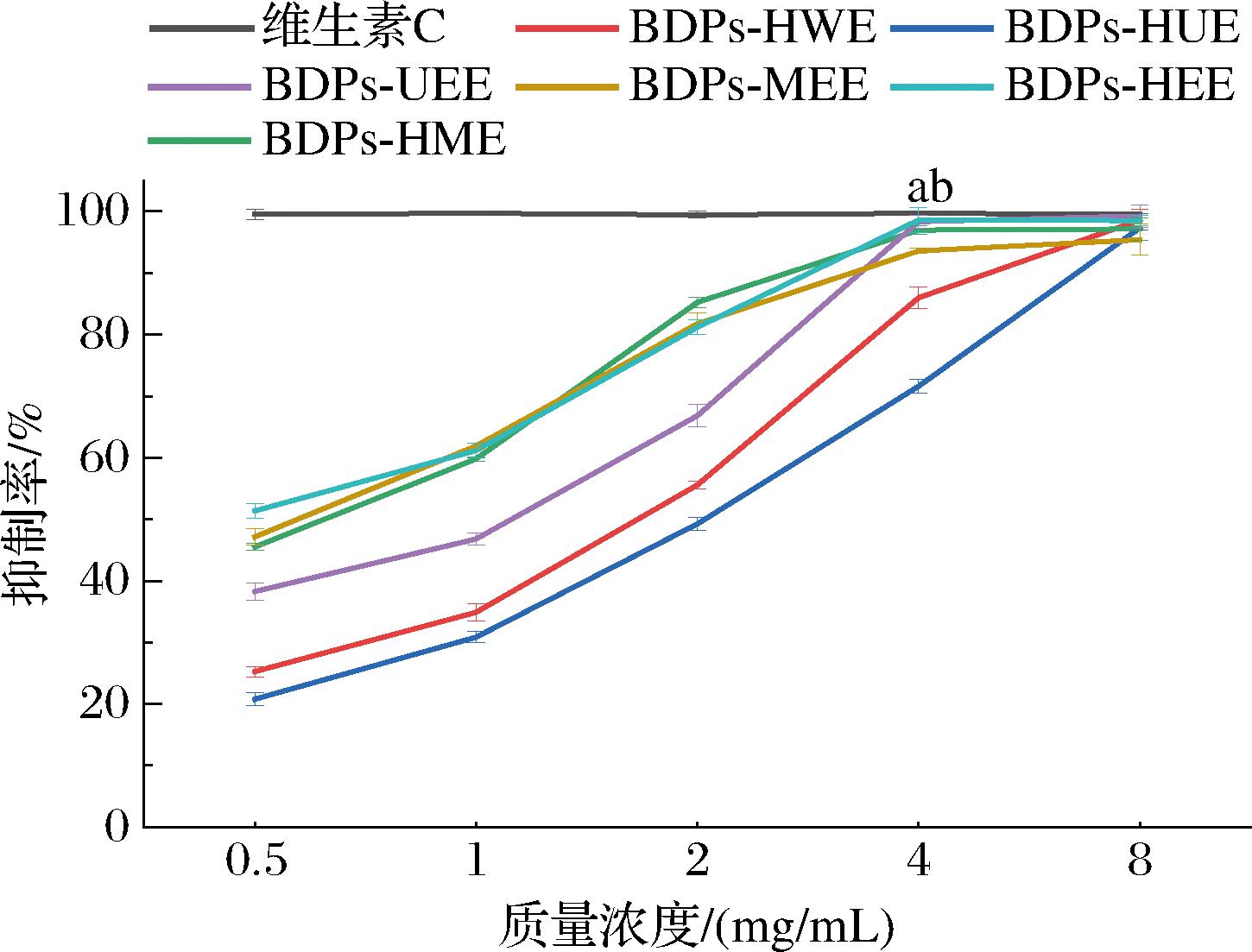 由图9可知,BDPs能有效地清除ABTS阳离子自由基,ABTS阳离子自由基的清除率和不同提取方法得到的多糖样品在给定浓度范围下的浓度呈正相关趋势。在高质量浓度(8 mg/mL)时BDPs对ABTS阳离子自由基的清除率最佳,其中BDPs-UEE对ABTS阳离子自由基的清除率最高,达到了98.44%,抗氧化效果接近于维生素C对照组。上述实验结果的产生或许归因于超声波提取BDPs的过程中,其机械性断键作用和空化效应使大分子多糖较敏感的化学键断裂,引起构象的改变,降低其分子质量,增加多糖的水溶性,使多糖中各单糖比例发生了改变,从而使其抗氧化能力显著增强[32]。分子质量较高的多糖分子含有较多的结构功能单元,这有助于维持其复杂的构象结构,但分子质量过大的多糖容易产生较大的分子体积,从而增加其跨膜阻力进而影响其发挥生物活性。分子质量较低的多糖通常具有更多的游离羟基和更高的还原糖含量,但分子质量过小的多糖不能拥有有效活性的寡糖片段,也会使具有强活性的高级结构(如三螺旋)无法形成。因此,适当分子质量的多糖可以很容易地穿过多个细胞膜屏障,并表现出最佳的生物活性[33],这可能是BDPs-UEE表现出对ABTS阳离子自由基清除率最高的原因之一。