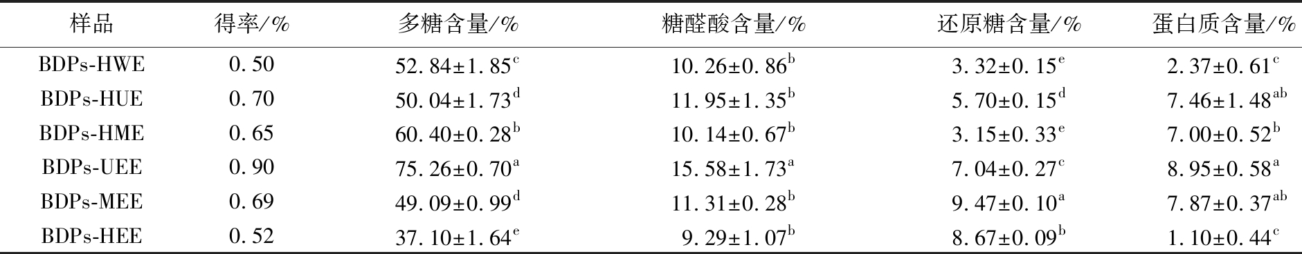 Table 2 The yield and chemical composition of BDPs by different extraction methods
