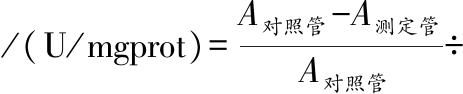式中:A测定管,含样品的溶液的吸光度值;A对照管,以等量蒸馏水替代样品的溶液的吸光度值;V总,反应液总体积,按试剂盒说明书添加各试剂后的溶液总体积,mL;V样,样品添加到反应体系中的体积量,mL;C样蛋白,待测样品的蛋白浓度,毫克蛋白数(mg prot/mL)。