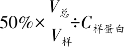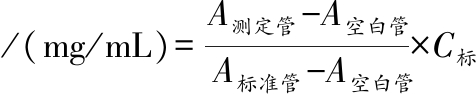 式中:A测定管,含有样品的溶液的吸光度值;A空白管,以蒸馏水替代样品的溶液的吸光度值;A标准管,含有标准品蛋白的溶液的吸光度值;C标,蛋白标准品的溶液质量浓度,mg/mL。