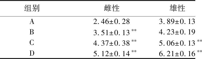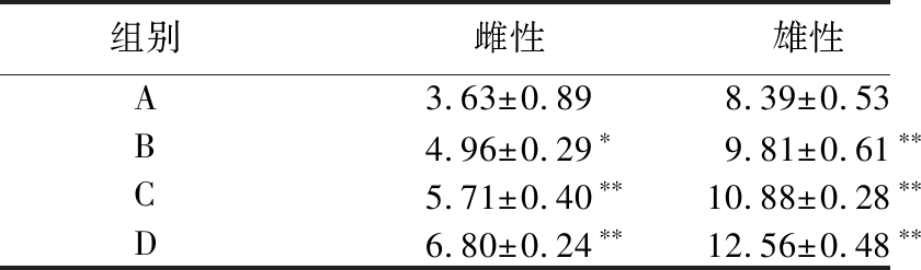 组别雌性雄性A3.63±0.898.39±0.53B4.96±0.29∗9.81±0.61∗∗C5.71±0.40∗∗10.88±0.28∗∗D6.80±0.24∗∗12.56±0.48∗∗
