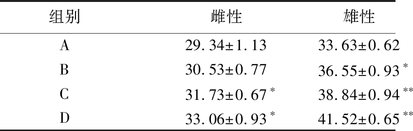 组别雌性雄性A29.34±1.1333.63±0.62B30.53±0.7736.55±0.93∗C31.73±0.67∗38.84±0.94∗∗D33.06±0.93∗41.52±0.65∗∗