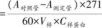 式中:A测定管,含样品的溶液的吸光度值;A对照管,以等量蒸馏水替代样品的溶液的吸光度值;271,斜率的倒数;V样,样品添加到反应体系中的体积量,mL;C样蛋白,待测样品的蛋白浓度,毫克蛋白数(mg prot/mL)。