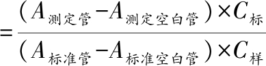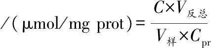 式中:A测定管,按说明书添加样品和试剂一、二、三的试管中的溶液的吸光度值;A测定空白管,不加试剂三溶液,其他试剂成分与测定管试剂相同的试管中溶液的吸光度值;A标准管,加标准品和试剂一、二、三的试管中的溶液的吸光度值;A标准空白管,以无水乙醇替代标准品,其他试剂与标准管试剂相同的试管中的溶液的吸光度值;C标,标准品蛋白浓度,nmol/mL;C样,待测样品蛋白浓度,毫克蛋白数(mg prot/mL)。