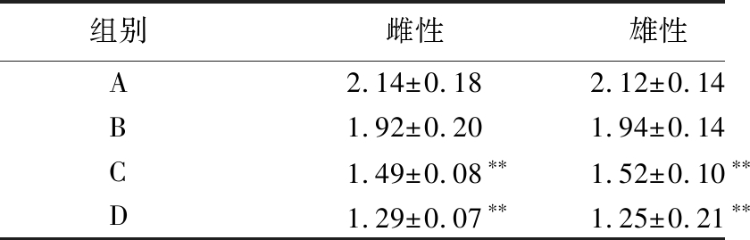 组别雌性雄性A2.14±0.182.12±0.14B1.92±0.201.94±0.14C1.49±0.08∗∗1.52±0.10∗∗D1.29±0.07∗∗1.25±0.21∗∗