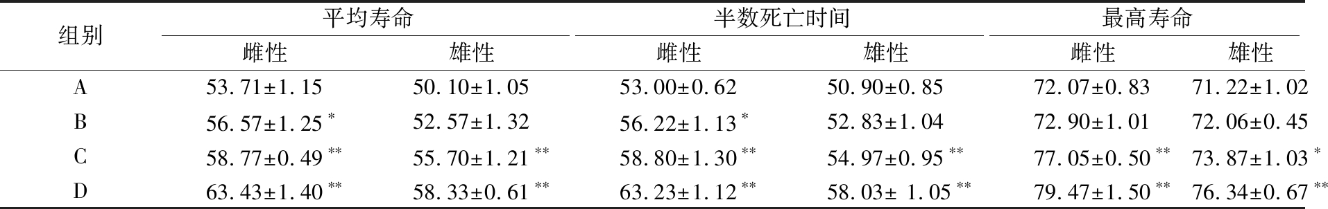 组别平均寿命半数死亡时间最高寿命雌性雄性雌性雄性雌性雄性A53.71±1.1550.10±1.0553.00±0.6250.90±0.8572.07±0.8371.22±1.02B56.57±1.25∗52.57±1.3256.22±1.13∗52.83±1.0472.90±1.0172.06±0.45C58.77±0.49∗∗55.70±1.21∗∗58.80±1.30∗∗54.97±0.95∗∗77.05±0.50∗∗73.87±1.03∗D63.43±1.40∗∗58.33±0.61∗∗63.23±1.12∗∗58.03± 1.05∗∗79.47±1.50∗∗76.34±0.67∗∗