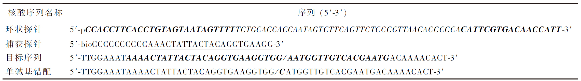 注:环状探针的5′磷酸化以便于连接,黑色加粗斜体完全与目的序列的黑色加粗斜体互补,下划线部分与捕获探针的下划线部分完全互补;目的序列的斜线部分的左右黑色加粗斜体表示分别与环状探针的5′和 3′末端黑色加粗斜体完全互补;单碱基错配的黑斜体序列与目标序列的相应位置单碱基错配。