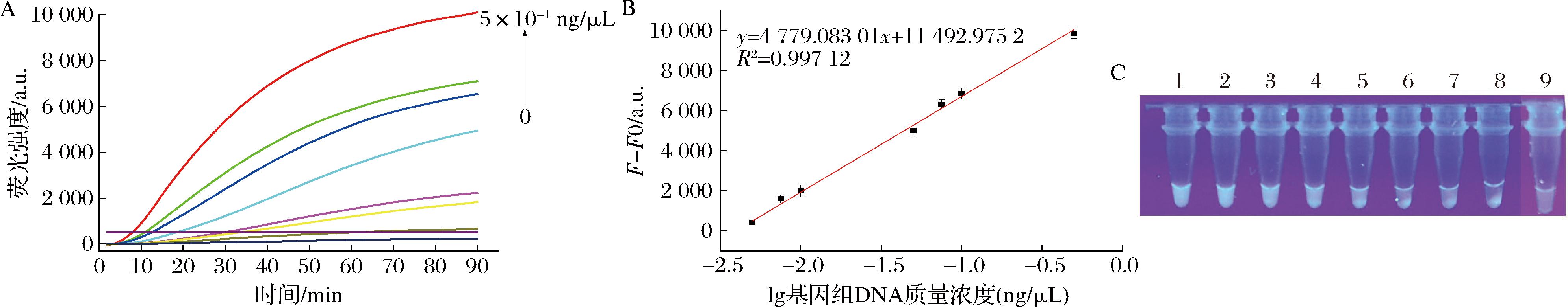 注:C图中1~9分别代表基因组DNA添加量为5×10-1、1×10-1、7.5×10-2、5×10-2、1×10-2、7.5×10-3、5×10-3、1×10-3、0 ng/μL。