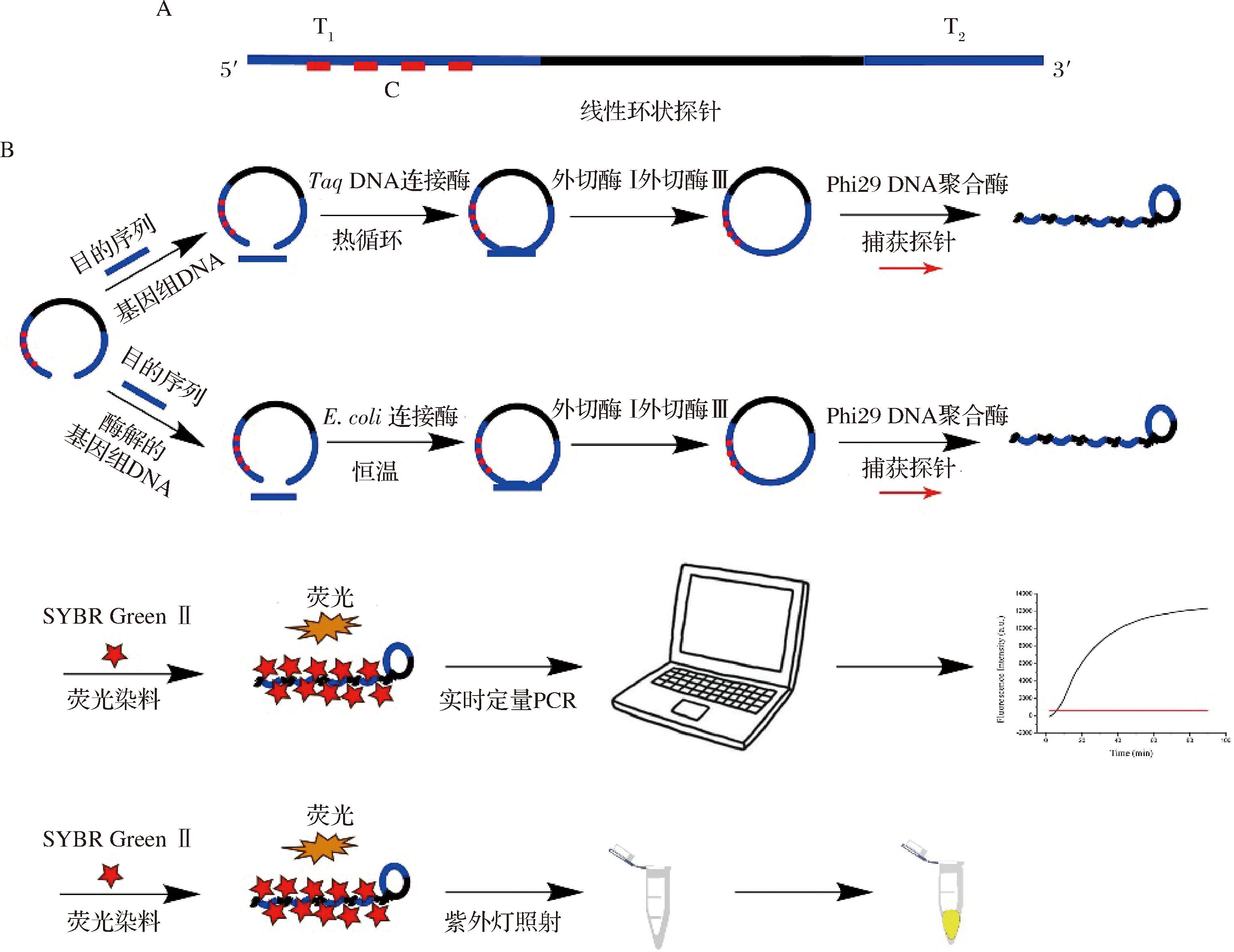 检测原理如图1所示,当目的序列可与线形环状探针的5′、3′末端完全杂交,5′、3′末端由E.coil DNA连接酶(Taq DNA连接酶)连接和环化,E.coil DNA连接酶(Taq DNA连接酶)不允许任何的错配,即使是单碱基的错配也会影响环化的形成。E.coil DNA连接酶耐高温能力不强,适用于恒温连接,为了保证所有的基因组DNA全部与线性环状探针连接,所以基因组DNA需要先用限制性内切酶进行片段化[10]以便于和线性环状探针的5′或3′末端进行杂交连接;Taq DNA连接酶耐高温能力较强,基因组DNA不需要片段化就可在温度循环的条件下将基因组DNA和线性环状探针的5′或3′末端进行杂交连接,所以适用于具有PCR仪器的条件下。连接后的体系在外切酶Ⅰ和外切酶Ⅲ的作用下将未反应的环状探针和目标物DNA分解,以免假阳性的出现。随后,捕获探针作为引物与环状探针的特定序列互补区域杂交进而在Phi29 DNA聚合酶和dNTPs存在的条件下引发RCA反应,RCA的产物是一条长的串联的与环状探针互补的重复的单链DNA序列[11]。RCA反应体系中存在SYBR GreenⅡ荧光染料,随着RCA反应的进行,单链DNA序列的数量增加,所产生的荧光信号被实时定量PCR监测,在不具备大型仪器实验条件的地方(如现场检验),也可以选择E.coil DNA连接酶在恒温条件下进行反应,在紫外灯的照射下观察荧光的变化从而实现结果的可视化。