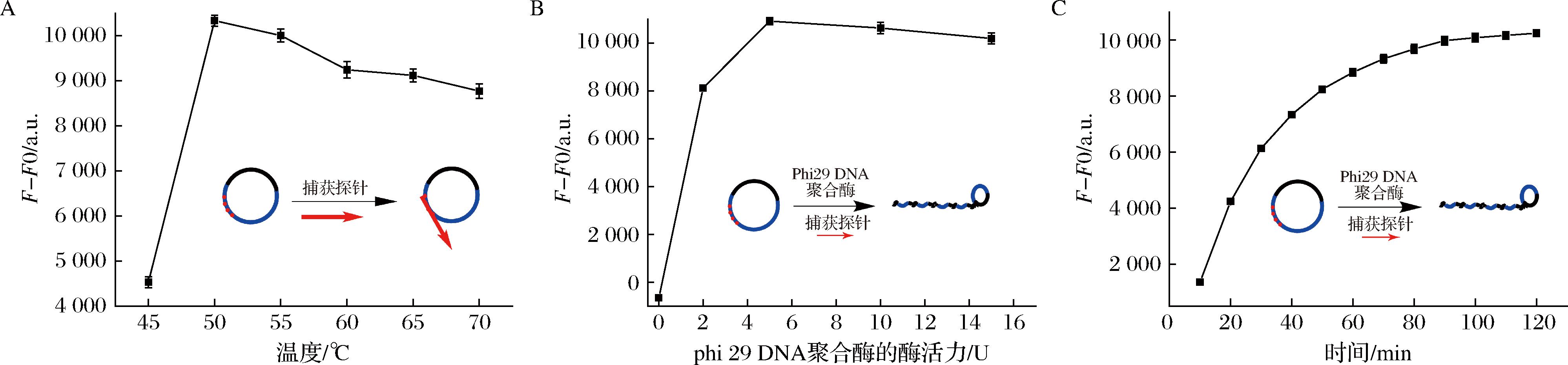 A-捕获连接的温度优化;B-Phi29 DNA聚合酶的最佳酶活优化;C-RCA扩增时间的优化