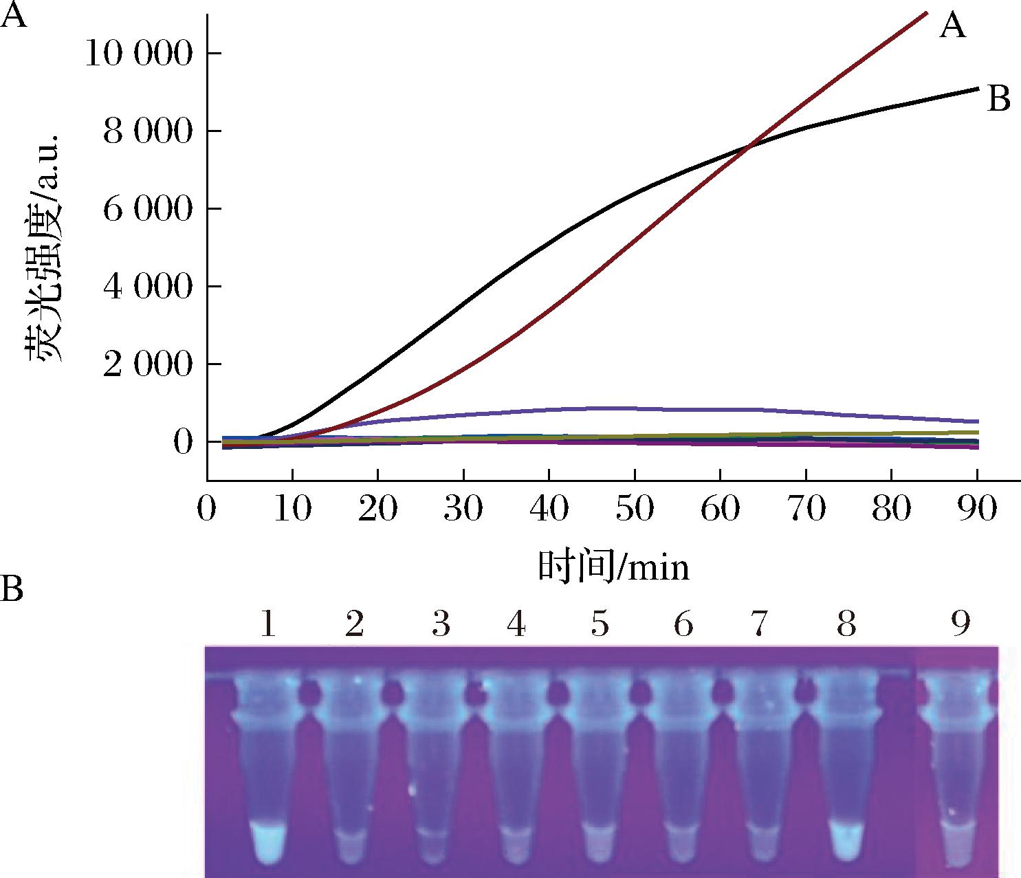 A-实时定量荧光输出模式的特异性;B-紫外线灯照射下信号响应输出模式的特异性
