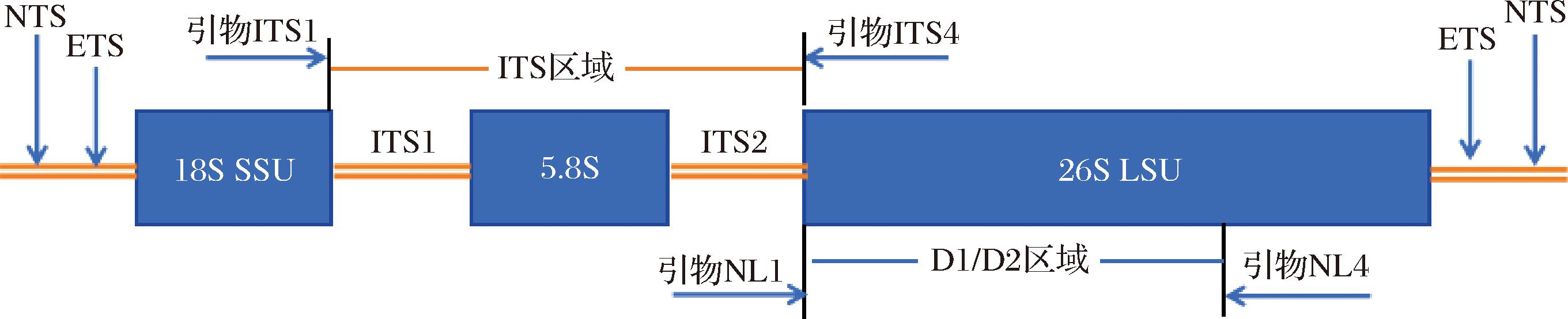 核糖体基因(5.8S、18S、26S)成簇排列形成转录单元,这些转录单元在基因组中串联重复100~200次。如图1所示,每个转录单元包含:编码区[18S(小亚基SSU)、5.8S、26S(大亚基LSU)基因];间隔区[内部转录间隔区(ITS):ITS1分隔18S与5.8S基因,ITS2分隔5.8S与26S基因;外部转录间隔区(ETS)];单元间分隔[非转录间隔区(NTS)]。另外图中还标明了常规测序所用的引物位置,即ITS区域所用引物(ITS1和ITS4)和26S rDNA D1/D2区域所用引物(NL1和NL4)。