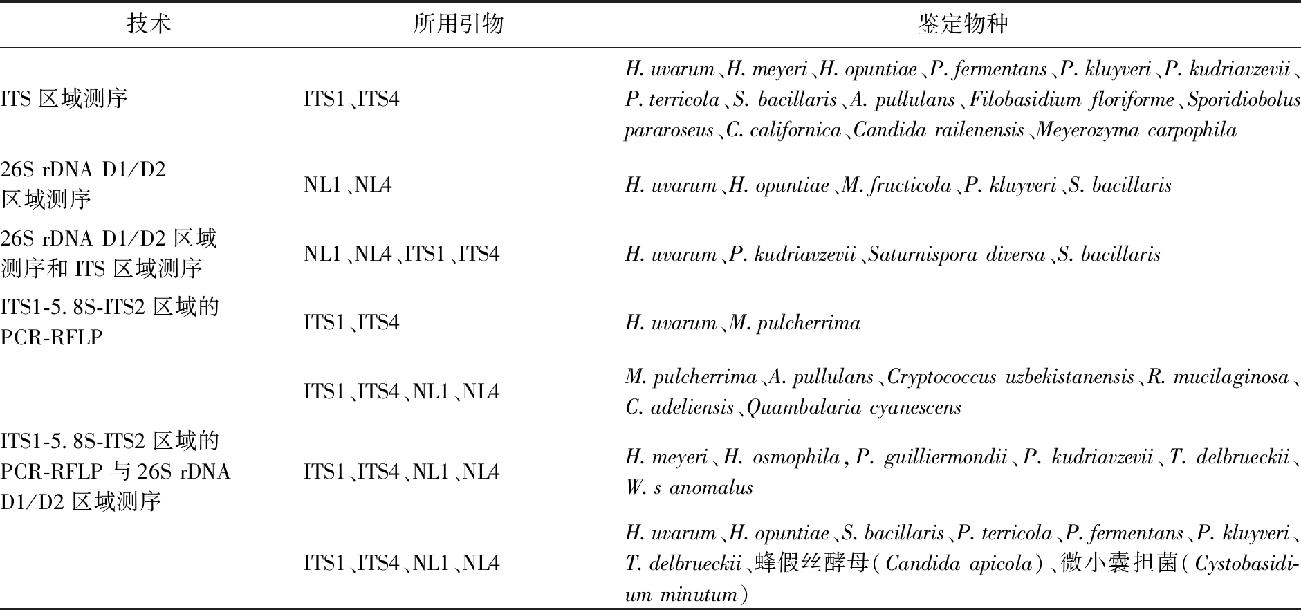 基于上述菌种鉴定方法,本文对其在非酿酒酵母菌种鉴定中的应用情况进行总结比较,并呈现于表1中。