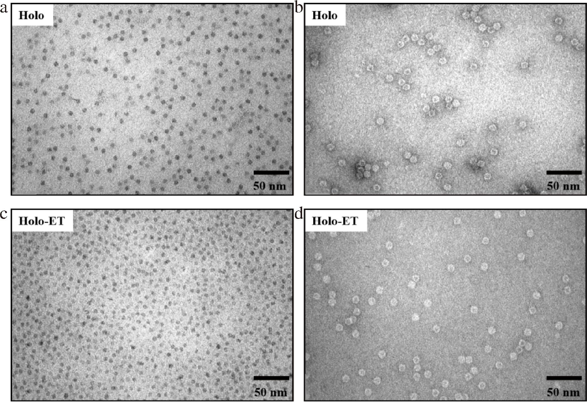 a-未经负染处理的对照组Holoferritin;b-经负染处理的对照组Holoferritin;c-未经负染处理的实验组Holoferritin;d-经负染处理的实验组Holoferritin