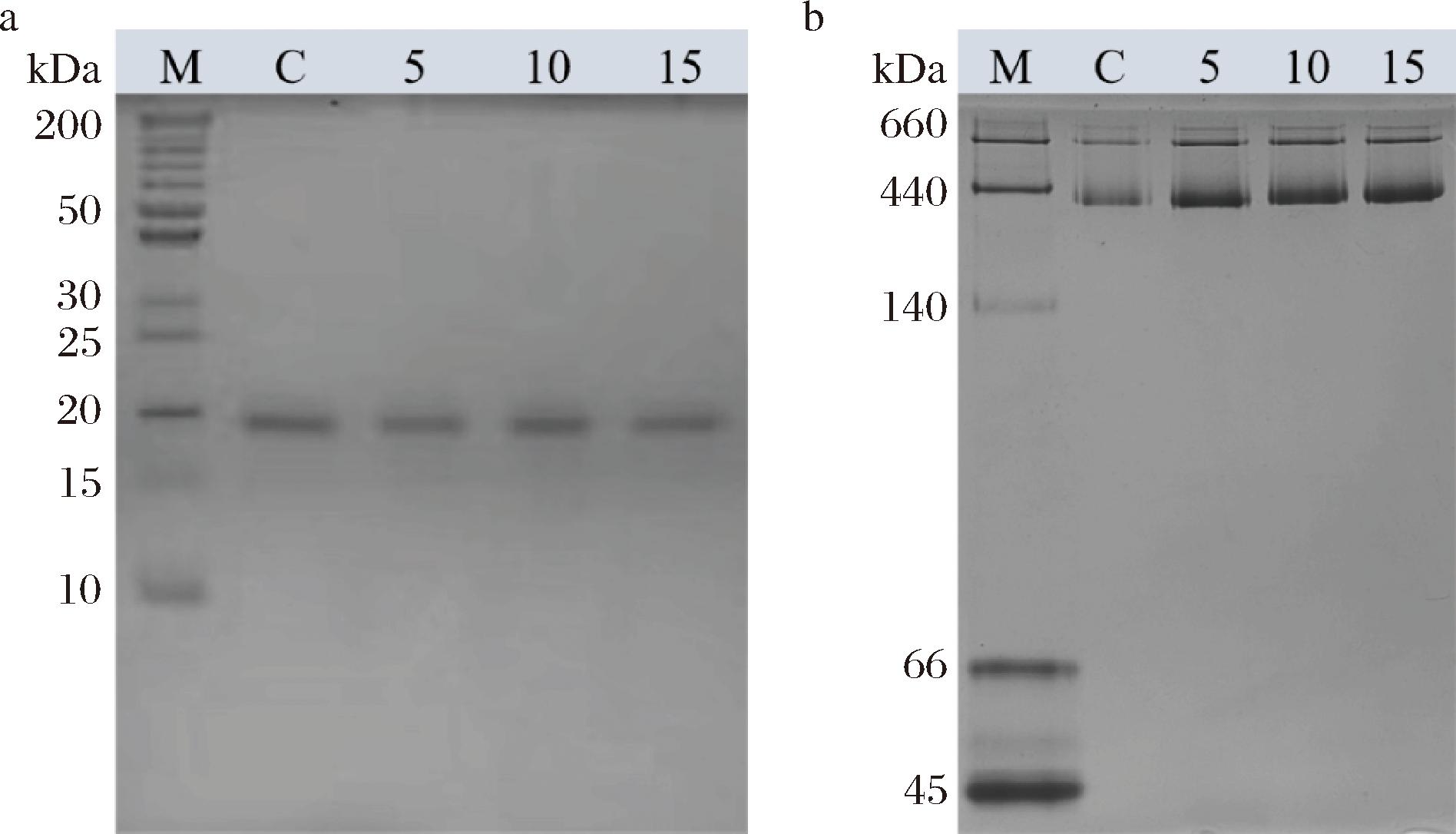 注:M,蛋白质标志物及其对应分子质量;C,未进行纯化的Holoferritin; 5,添加0.005%核酸酶处理的Holoferritin;10,添加0.010%核酸酶处理的Holoferritin;15,添加0.015%核酸酶处理的Holoferritin(下同)。
