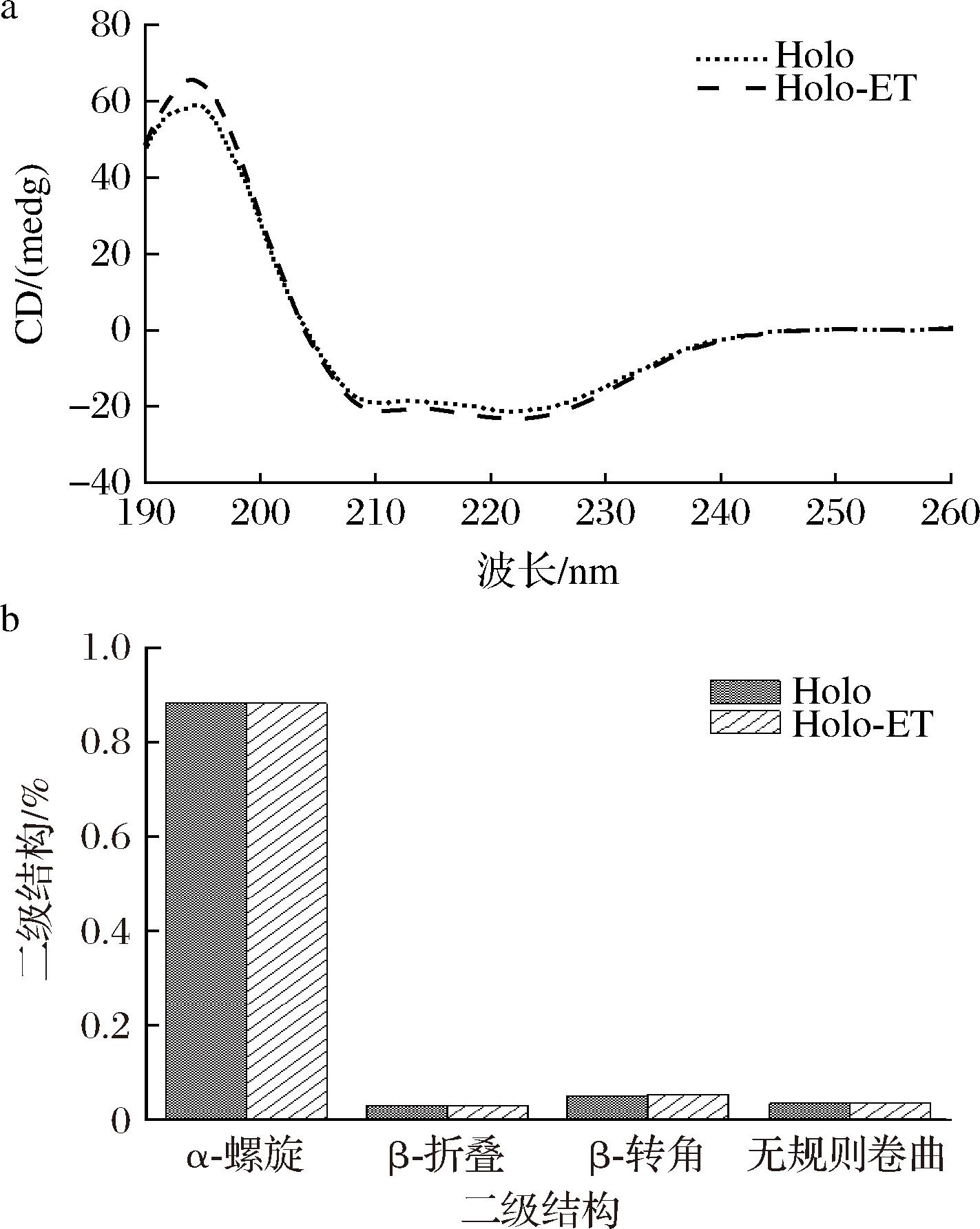 a-对照组和实验组Holoferritin的CD光谱;b-对照组和实验组Holoferritin的二级结构含量
