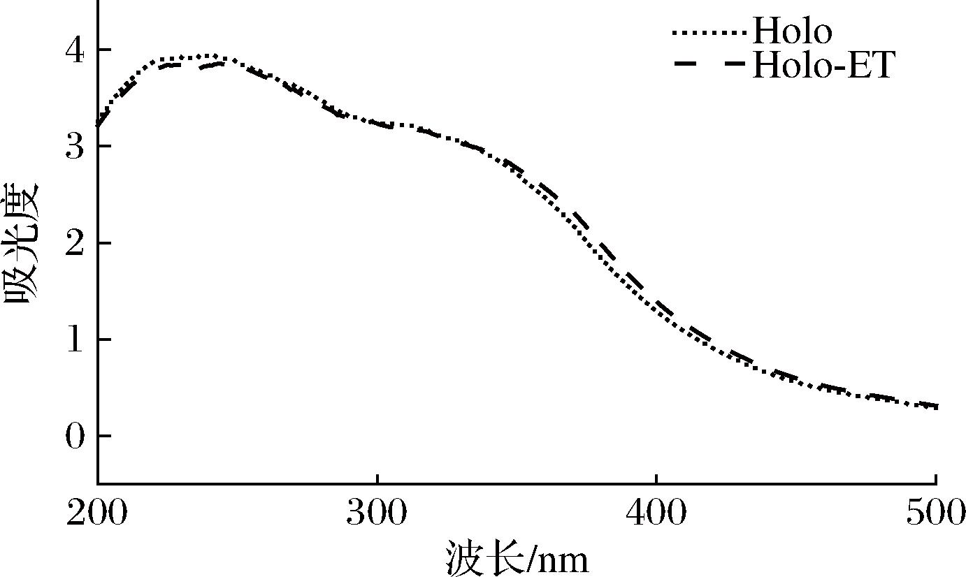上述结果表明,添加0.005%核酸酶处理即可使样品中宿主残留的核酸完全去除,且提取的Holoferritin为电泳条带单一的高纯度蛋白。因此,本研究后续将经阴离子交换色谱柱层析(未添加核酸酶处理)的Holoferritin样品作为对照组(Holoferritin,Holo),添加0.005%核酸酶处理纯化(未经阴离子交换色谱柱层析)的Holoferritin样品作为实验组(Holoferritin-enzyme treatment,Holo-ET)。定量测定两者的蛋白质回收率发现,本研究提出的制备工艺可以将Holoferritin的回收率由(69.8±2.03)%提升至(88.2±2.54)%,同时将纯化周期由72 h压缩至48 h,显著提升Holoferritin的制备效率。后续,本研究将通过对比分析两者的结构特征,阐明该制备工艺对Holoferritin结构的影响。