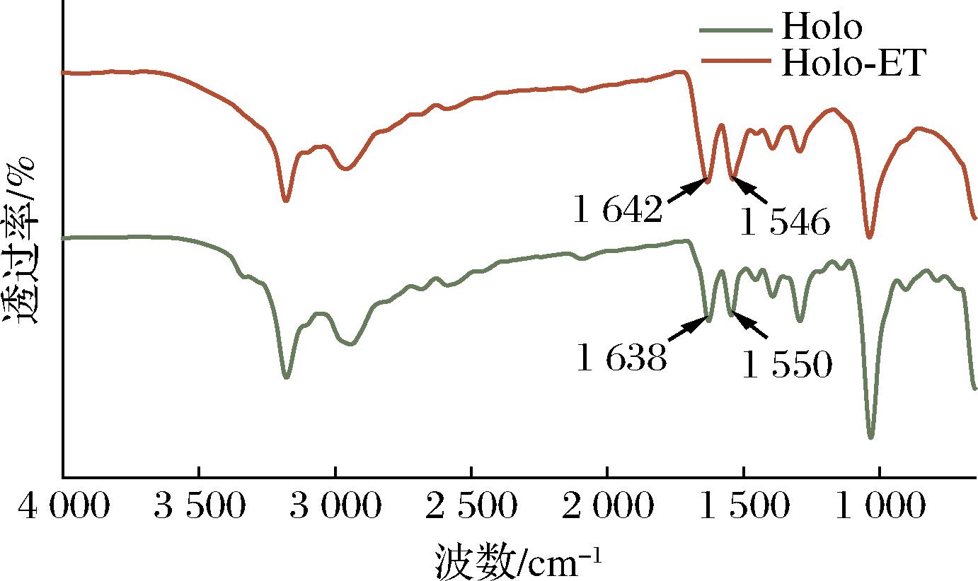 为阐明此制备工艺对蛋白结构的影响机制,本研究采用傅里叶变换红外光谱对其结构进行表征。如图5所示,对照组Holoferritin在1 638、1 550 cm-1处分别呈现属于酰胺Ⅰ带(1 600~1 700 cm-1)和酰胺Ⅱ带(1 500~1 600 cm-1)的特征吸收峰[21]及C