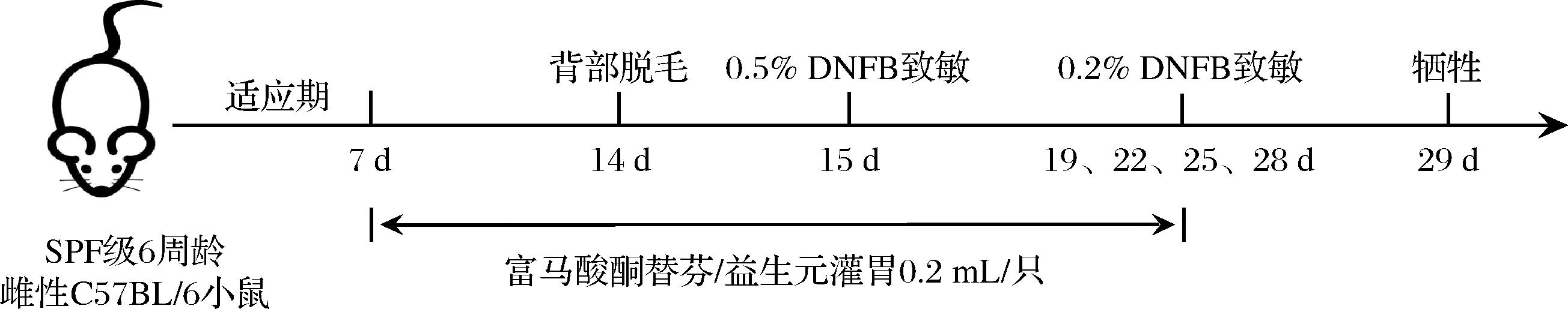 2,4-二硝基氟苯(2,4-dinitrofluorobenzene,DNFB)、富马酸酮替芬盐(阳性药物),美国Sigma-Aldrich公司;小鼠血清免疫球蛋白E(immunoglobulin E,IgE)、炎症因子检测试剂盒,美国R&D公司;BCA蛋白定量检测试剂盒、蛋白酶抑制剂,上海碧云天生物技术有限公司;橄榄油、丙酮、NaCl,国药集团化学试剂有限公司;FOS(纯度99%)、GOS(纯度70%)、XOS(纯度95%)、菊粉(纯度90%),上海博飞美科化学科技有限公司。