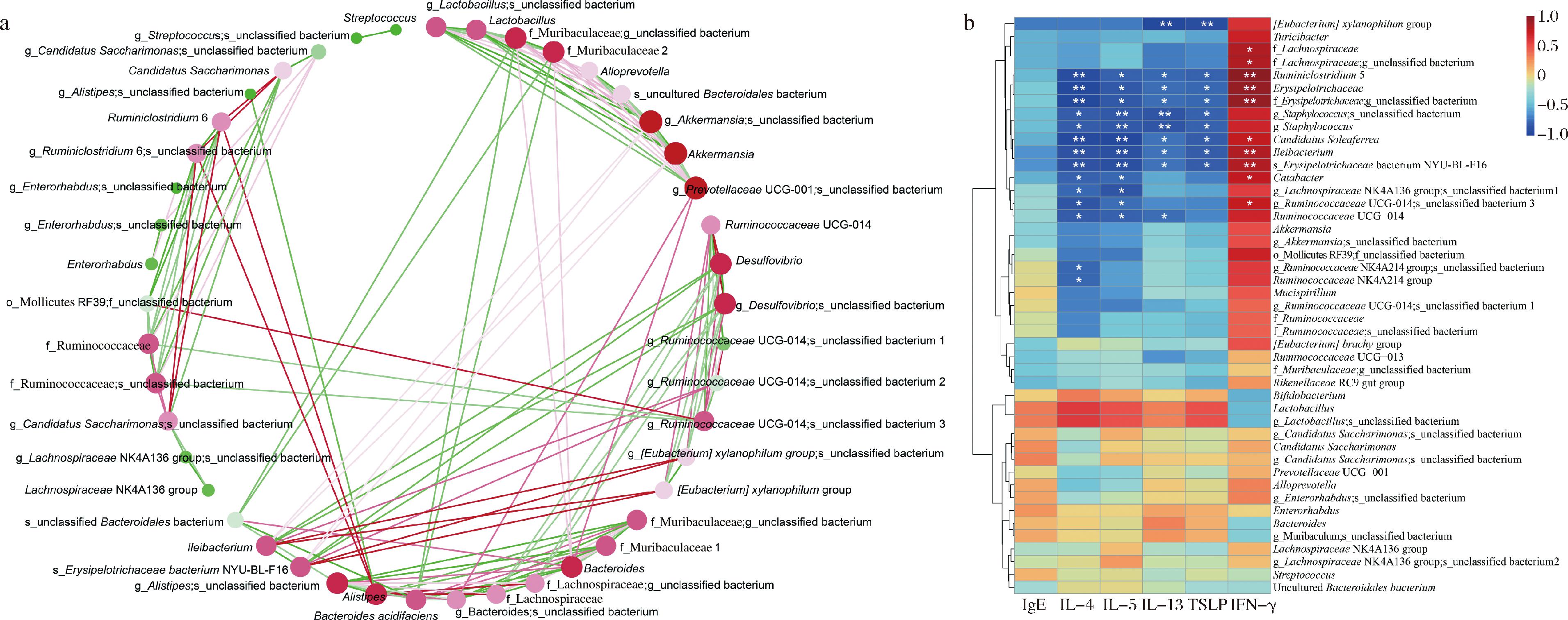 a-肠道菌群互作网络分析结果;b-肠道菌群与免疫炎症因子相关性分析