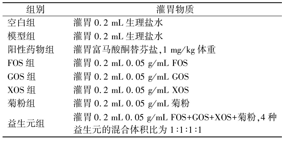组别灌胃物质空白组灌胃0.2 mL生理盐水模型组灌胃0.2 mL生理盐水阳性药物组灌胃富马酸酮替芬盐,1 mg/kg体重FOS组灌胃0.2 mL 0.05 g/mL FOSGOS组灌胃0.2 mL 0.05 g/mL GOSXOS组灌胃0.2 mL 0.05 g/mL XOS菊粉组灌胃0.2 mL 0.05 g/mL菊粉益生元组灌胃0.2 mL 0.05 g/mL FOS+GOS+XOS+菊粉,4种益生元的混合体积比为1∶1∶1∶1