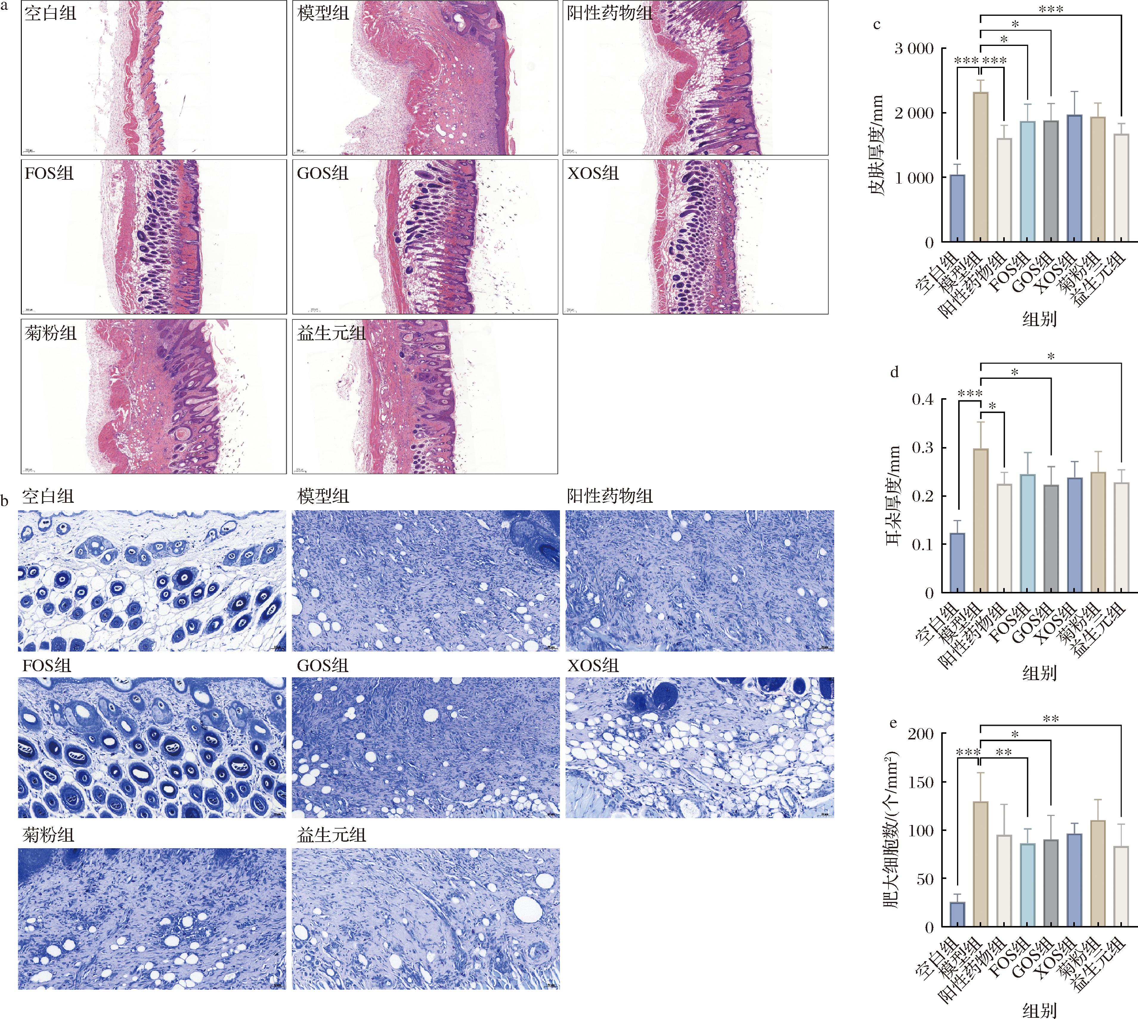 DNFB的局部反复使用能够诱导小鼠皮肤出现AD的临床症状,小鼠耳朵厚度的变化反映了局部炎症浸润导致的耳朵肿胀程度。与空白组相比(图2-d),DNFB显著诱导小鼠耳朵厚度增加(n=5, P<0.001),而阳性药物组和各益生元干预组的小鼠耳朵肿胀程度均不同程度降低,其中,GOS益生元干预显著降低了小鼠耳朵厚度(n=5, P<0.05),表明益生元的摄入对于AD引起的耳部皮肤肿胀具有缓解作用。