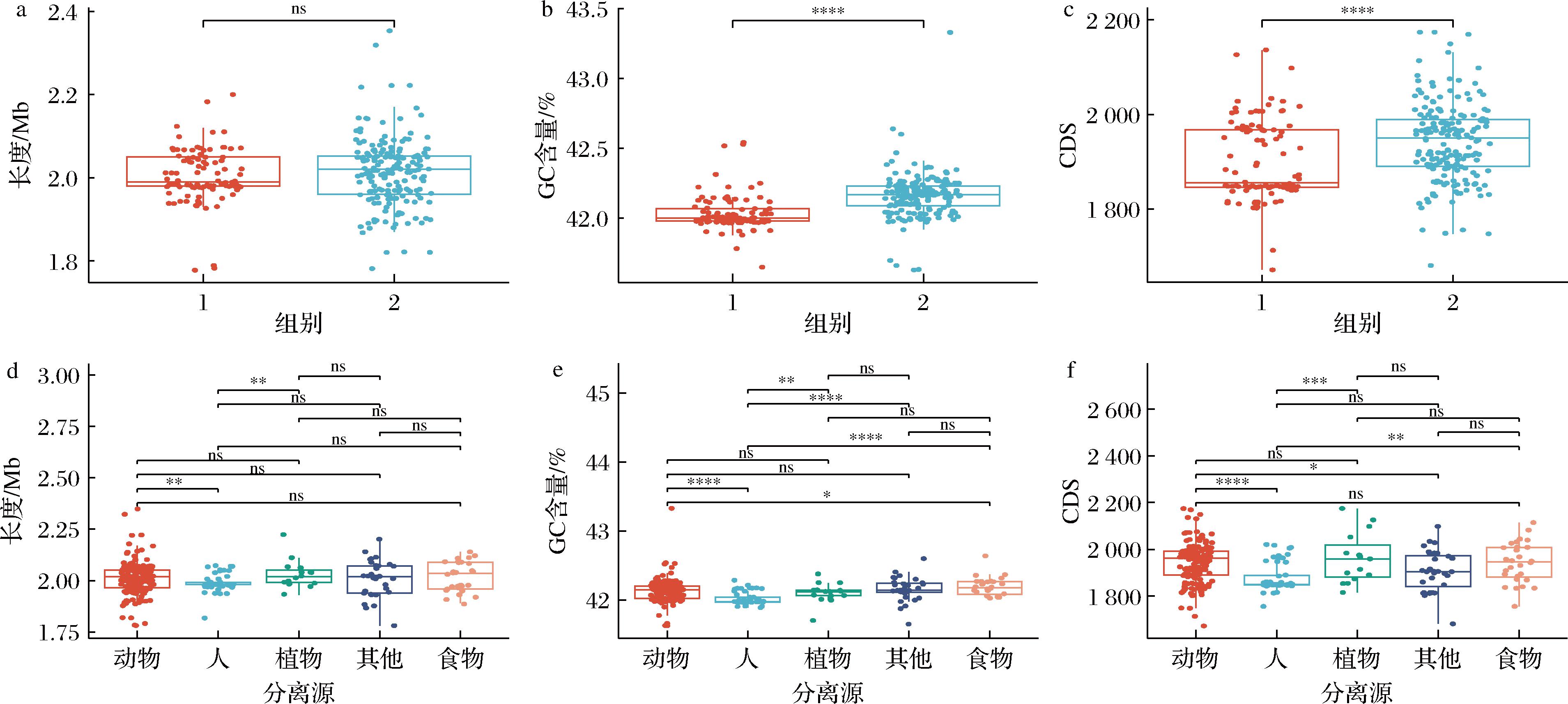 a-不同遗传分支基因组大小显著性差异分析;b-不同遗传分支GC含量显著性差异分析;c-不同遗传分支CDS数量显著性差异分析;d-不同分离源基因组大小显著性差异分析;e-不同分离源GC含量显著性差异分析;f-不同分离源CDS数量显著性差异分析