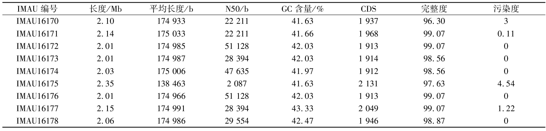 IMAU编号长度/Mb平均长度/bN50/bGC含量/%CDS完整度污染度IMAU161702.10174 93322 21141.631 93796.303IMAU161712.14175 03322 21141.661 96899.070.11IMAU161722.01174 98551 12842.031 91399.070IMAU161732.01174 98728 39442.031 91498.560IMAU161742.03175 00647 63541.971 91298.560IMAU161752.35138 4632 08741.632 13197.634.54IMAU161762.01174 96651 12842.031 91399.070IMAU161772.15174 99128 39443.332 04999.071.22IMAU161782.06174 98629 55442.471 94698.870