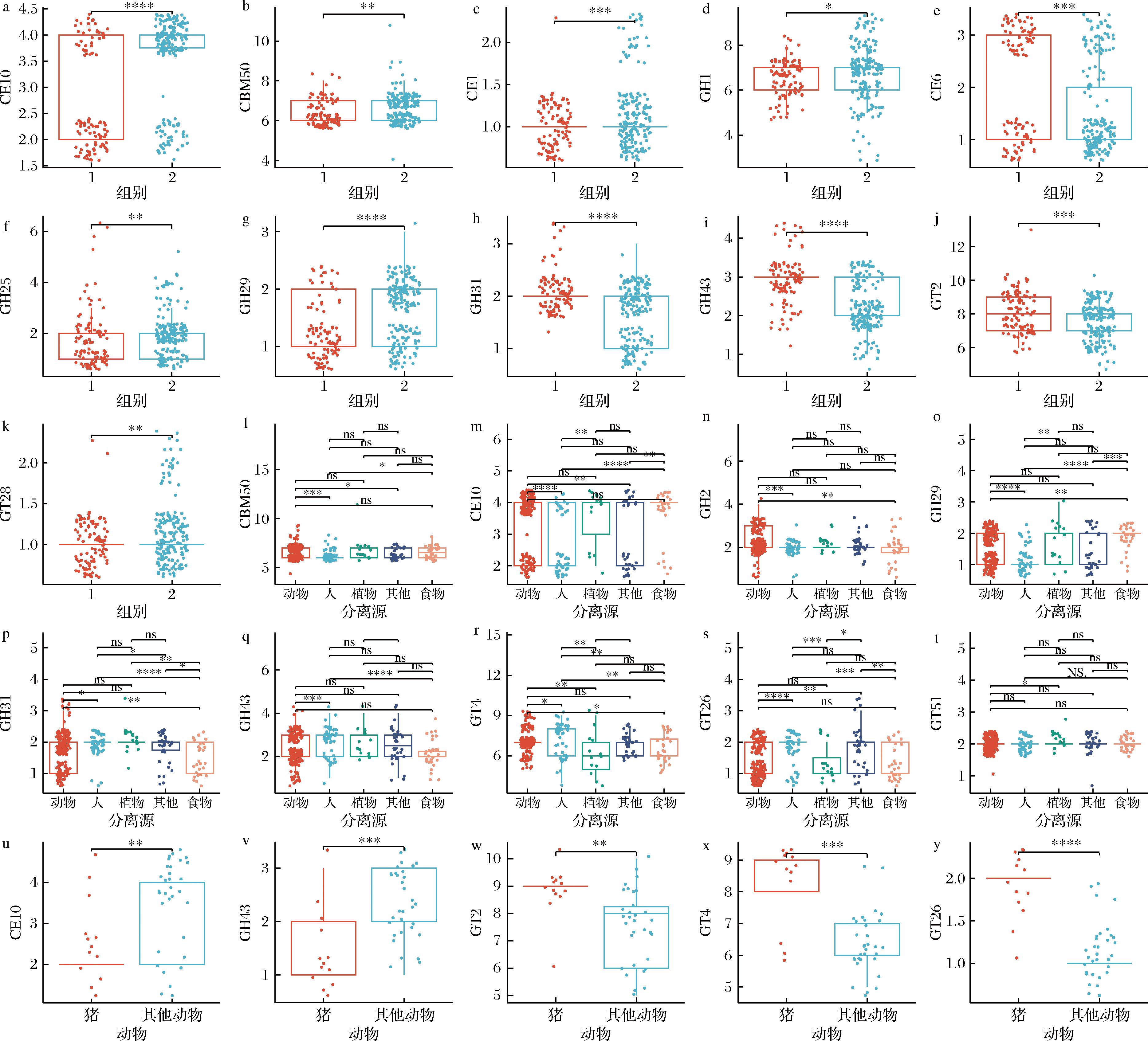a~k-不同遗传分支CAZys家族基因拷贝数显著性差异分析;l~t-不同分离源CAZys家族基因拷贝数显著性差异分析;u~y-猪源与其他动物体内分离菌株CAZys家族基因拷贝数显著性差异分析