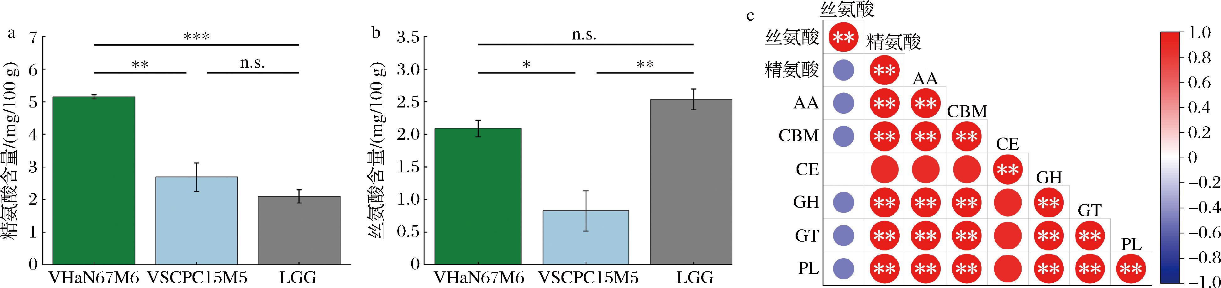 精氨酸含量如图5-a所示,热带来源菌株发酵组的精氨酸含量最高[(5.15±0.11) mg/100 g],显著高于非热带来源菌株[(2.69±0.75 mg/100 g),P≤0.01]和LGG组[(2.10±0.36) mg/100 g,P≤0.001],而非热带来源菌株与LGG组间无显著差异(P>0.05)。