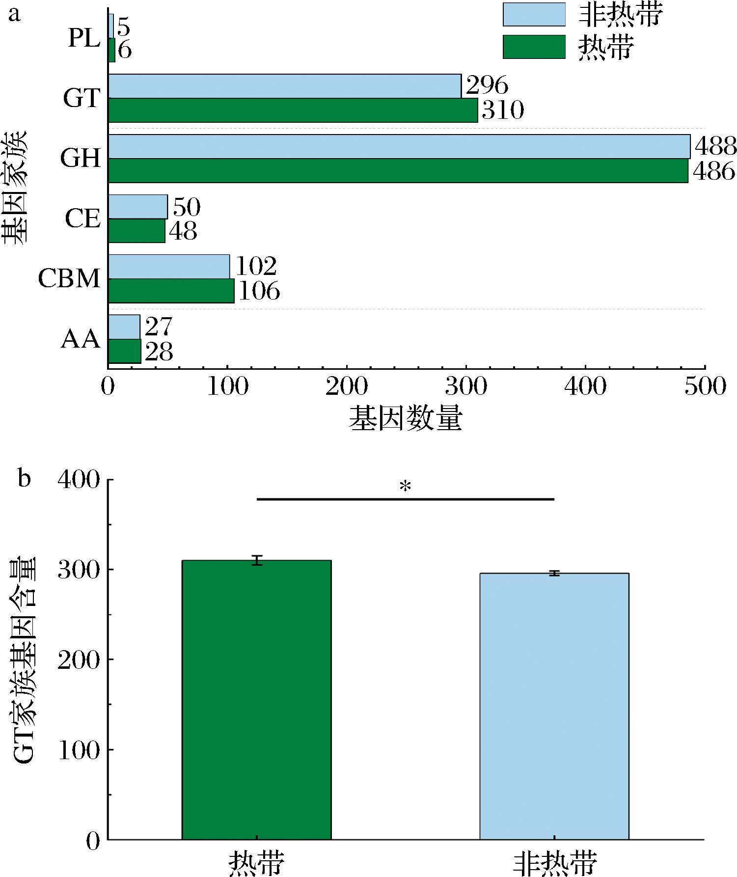 a-CAZy家族基因注释各类别直方图;b-GT家族基因平均含量