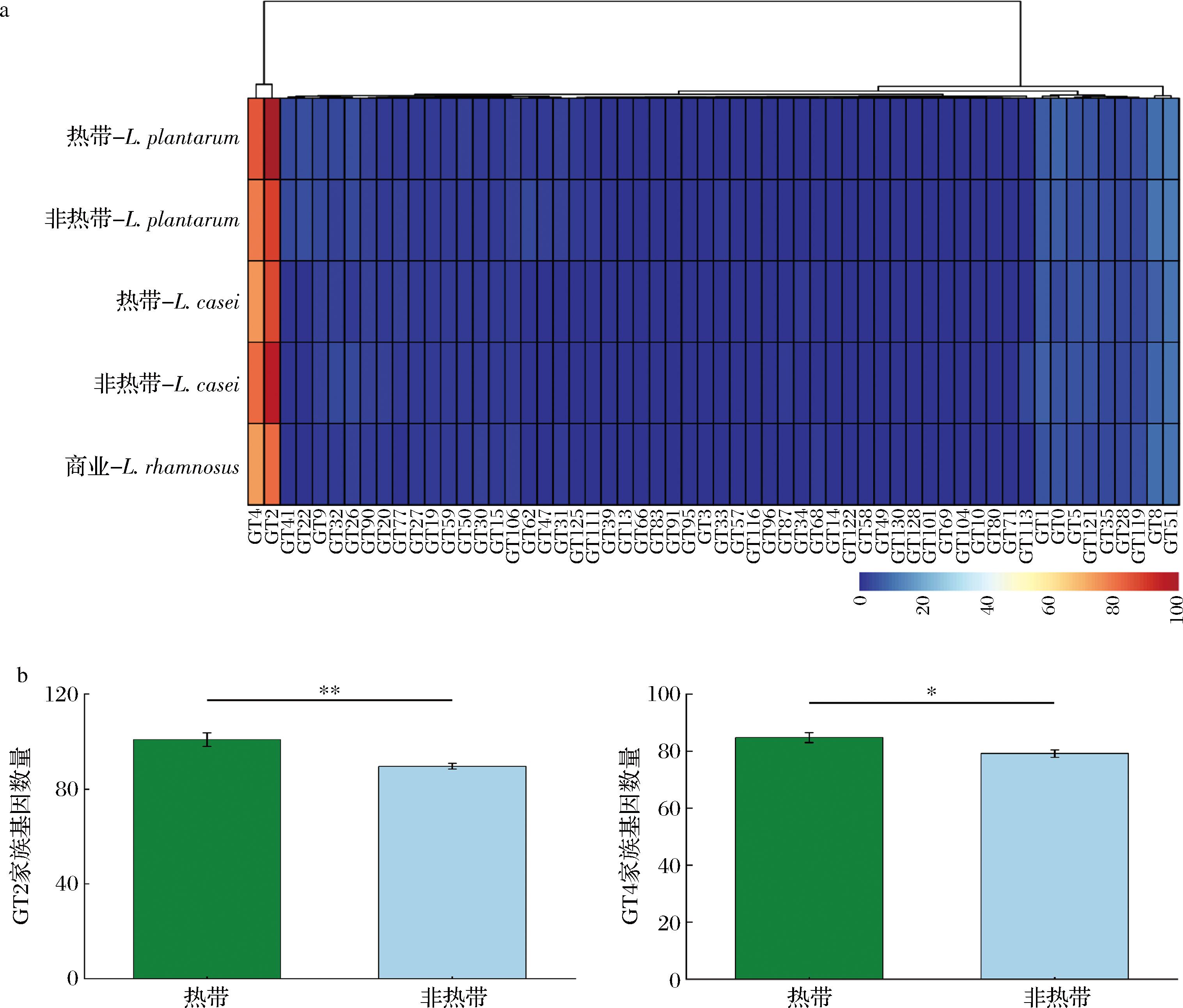 a-GT家族注释相关基因热图;b-植物乳植杆菌中GT2和GT4家族基因的平均含量