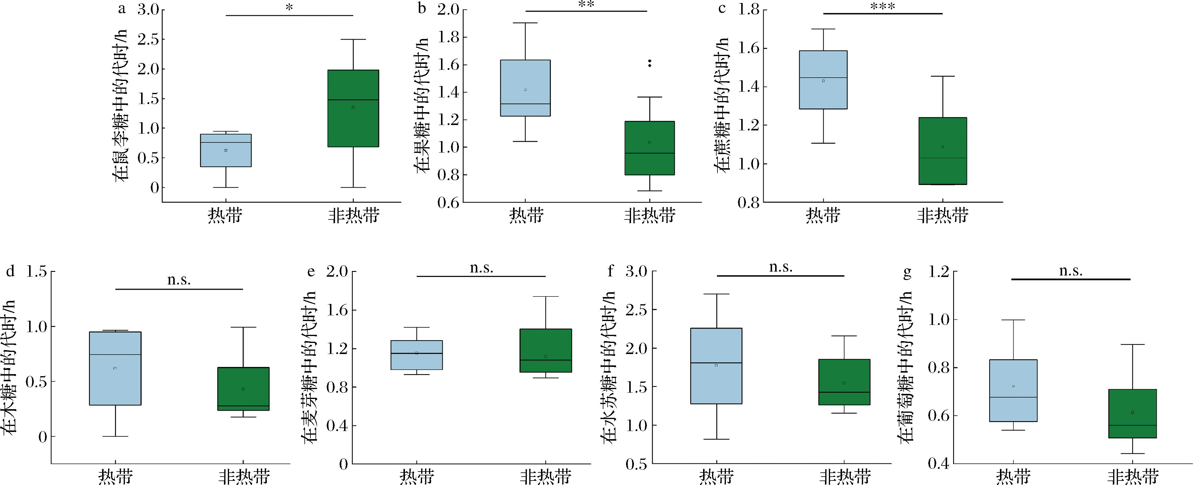 带来源的L.plantarum在以鼠李糖为唯一碳源时,代时(0.62±0.11) h显著低于非热带菌株[(1.35±0.27) h,P<0.05,图3-a];然而,在果糖[(1.42±0.09) vs (1.03±0.09) h,P<0.01,图3-b]和蔗糖[(1.43±0.06) vs (1.09±0.06) h,P<0.01,图3-c]作为唯一碳源时,其代时均显著高于非热带菌株。这表明热带菌株在稀有糖(如鼠李糖)的高效代谢中存在进化优势,而对常见糖类(蔗糖、果糖)的利用能力则弱于非热带菌株,提示菌株碳源代谢策略与其地理生态适应性存在显著关联。此外,热带与非热带来源的L.plantarum在木糖、麦芽糖、水苏糖和葡萄糖作为唯一碳源时,代时差异无统计学意义(P>0.05)。