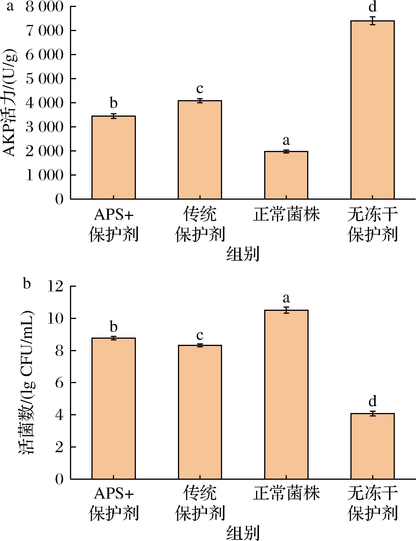 AKP作为定位于细胞壁-膜界面的关键酶,其胞外活力可灵敏反映壁结构完整性[30]。如图4-a所示,正常菌株组的AKP活力最低(1 978.67±61.67) U/g,代表了未冻干菌体的天然细胞壁-膜完整状态。未添加冻干保护剂组的AKP活力最高(7 396±160.10) U/g,显著高于其他组(P<0.05),表明冻干过程对细胞壁造成了严重破坏,与正常菌株组(1 978.67±61.67) U/g相比,活力升高了2.7倍,说明冻干导致了不可逆的损伤。相比之下,APS+保护剂组的AKP活力(3 450.33±95.83) U/g较无保护剂组降低了55.4%(P<0.05),证明APS能够显著减轻冻干对细胞壁的损伤。此外,APS组的AKP活力较传统保护剂组(4 082±85.02) U/g降低了15.5%,表明添加APS后保护效果优于传统保护剂,可能通过增强膜稳定性、增强细胞壁的机械强度或发挥抗氧化作用等机制实现。
