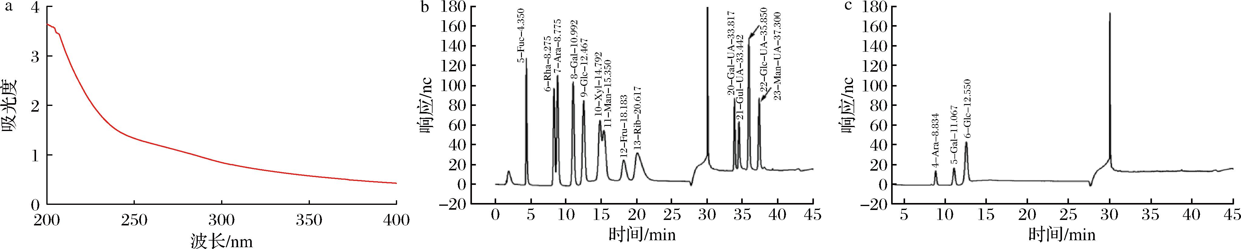 a-APS紫外吸收光谱;b-单糖标准品高效液相色谱图;c-黄芪纯化多糖高效液相色谱图