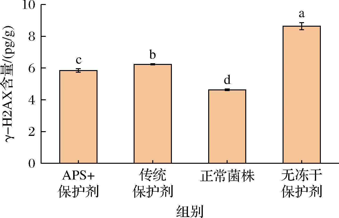 γ-H2AX是DNA双链断裂的敏感标记物,其表达水平与DNA损伤程度呈正相关[36]。由图6可知,无冻干保护剂组的γ-H2AX含量最高,为(8.63±0.23) pg/g,显著高于其他组(P<0.05),可能是冻干过程引发的氧化应激或机械损伤导致了严重的DNA断裂。而添加APS的保护组γ-H2AX含量为(5.85±0.11) pg/g较无保护剂组降低了32.2%(P<0.05),传统保护剂组的γ-H2AX含量(6.23±0.037) pg/g异常低于正常菌株组(4.63±0.05) pg/g。相比之下,APS组的γ-H2AX含量虽高于正常菌株,但更接近未冻干的天然状态,表明其保护作用更侧重于减少损伤而非干扰信息传递。结果证明,APS能够有效缓解DNA损伤,其机制可能涉及清除冻干过程中产生的自由基、减少氧化攻击或通过稳定染色质结构限制DNA链断裂[37]。