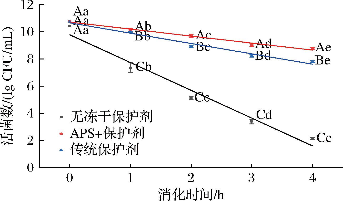 如图7所示,APS对胃肠消化的保护作用显著优于传统保护剂和未加保护剂组。未加冻干保护剂的菌粉在胃液消化阶段(0~2 h)活菌数急剧下降,0 h初始活菌数为(10.42±0) lg CFU/mL,1 h后降至(7.36±0.36) lg CFU/mL,2 h后进一步降至(5.13±0.12) lg CFU/mL,表明胃液对冻干后的菌体造成了严重损伤;进入肠液消化阶段(2~4 h)后,活菌数持续衰减至(3.39±0.18) lg CFU/mL(3 h)和(2.15±0.08) lg CFU/mL(4 h),存活率仅为20.6%,未保护菌体在胃肠消化后几乎完全失活。相比之下,APS组的活菌数在胃液阶段仅轻微下降,0 h为(10.79±0) lg CFU/mL,1 h和2 h分别维持在(10.16±0.11) lg CFU/mL(降幅5.8%)和(9.71±0.13) lg CFU/mL(降幅10.0%),显著优于传统保护剂组同期活菌数。进入肠液消化后,APS组的活菌数仍稳定保持在(9.03±0.11) lg CFU/mL(3 h)和(8.77±0.09) lg CFU/mL(4 h),存活率达81.3%,传统保护剂组在肠液环境中保护效果明显减弱,3 h活菌数降至(8.24±0.09) lg CFU/mL,4 h进一步降至(7.81±0.07) lg CFU/mL。而传统保护剂组在2 h(肠液起始点)出现异常骤降,可能与其在酸碱环境切换时稳定性不足相关,而APS组在此阶段未出现显著波动,表明其保护机制具有酸碱适应性。