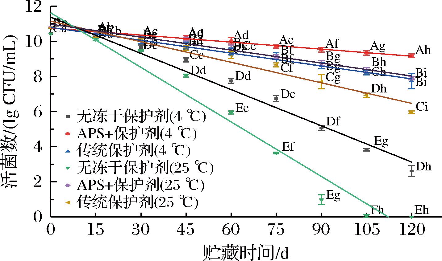 如图8所示,在4 ℃贮藏条件下,APS组的活菌数从初始的10.79 lg CFU/mL,经120 d仅下降至9.18 lg CFU/mL,平均衰减速率为0.013 lg CFU/(mL·d),显著低于传统保护剂组和无保护剂组。APS组在60 d后活菌数仍维持在10.02 lg CFU/mL以上,表明APS能有效抑制低温贮藏中的代谢性损伤。在常温贮藏(25 ℃)至120 d时,APS组活菌数从10.79 lg CFU/mL降至7.89 lg CFU/mL,而传统保护剂组从10.75 lg CFU/mL降至5.96 lg CFU/mL,无保护剂组从5.21 lg CFU/mL降至1.46 lg CFU/mL,衰退更快。