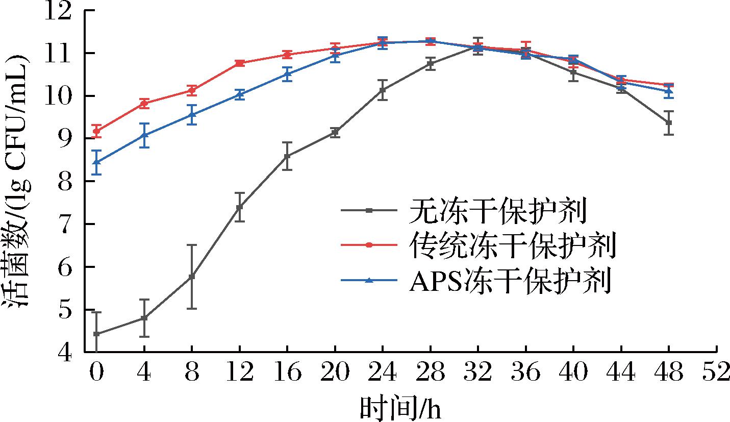 未添加保护剂(CK)、加入APS的冻干保护剂(A)和添加传统保护剂(B)后嗜酸乳杆菌CICC 22162冻干存活率分别为36.52%、78.64%和85.02%。如图2所示,A组在培养中后期保持了最高的活菌水平,且稳定性优于B组和CK组。A组和B组生长现象大致相同,但是CK组的嗜酸乳杆菌延滞期较长,进入稳定期的时间比另外2组迟滞约4 h。结果说明,APS的加入可以有效唤醒嗜酸乳杆菌的生长,加快生长速率。3组嗜酸乳杆菌生长趋势和最终生物量趋向于一致,但添加传统冻干保护剂配方的菌株进入稳定期的时间有一定的迟滞,其最终生物量略低于添加了APS的冻干菌粉。需要注意的是,本研究中APS保护剂的活性成分含量较传统组高8.3%,可能贡献了部分效果提升。结果表明APS可能为嗜酸乳杆菌的初始生长提供了更多的碳源。