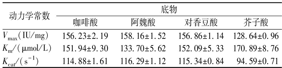 分别以咖啡酸、阿魏酸、对香豆酸、芥子酸为底物,在反应体系中添加不同浓度的底物溶液(0.1~5 mmol/L),在最适pH和最适温度下反应15 min,利用软件OriginPro 2018进行非线性回归拟合,计算Vmax、Km、Kcat。