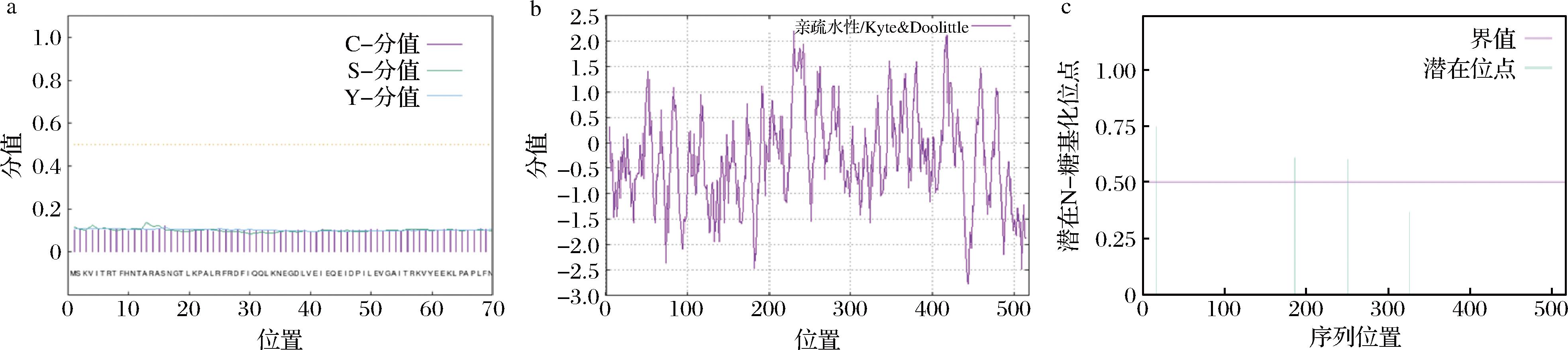 a-信号肽预测;b-亲疏水性分析(分值>0表示疏水性;分值<0表示亲水性);c-糖基化位点预测