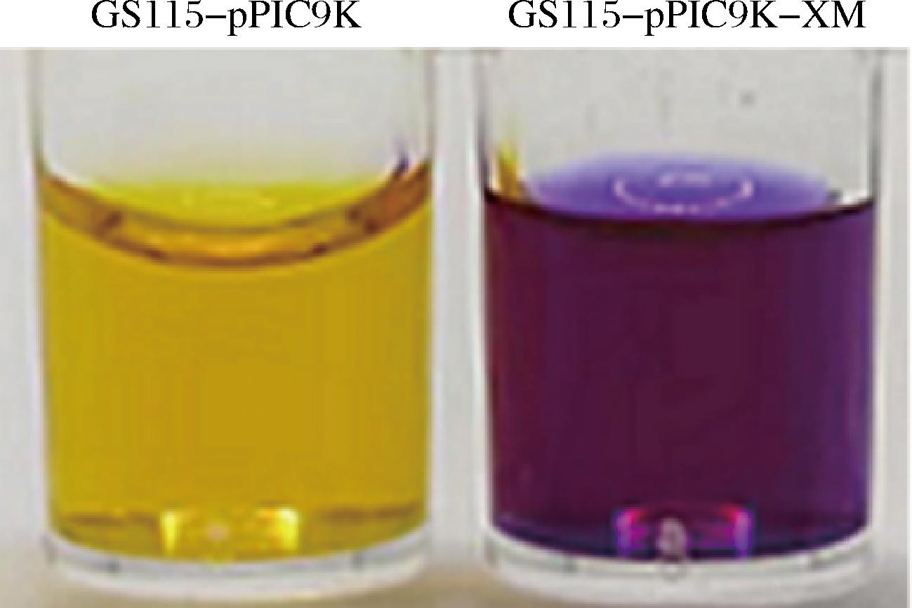 如图3-b所示,将100 μL GS115-pPIC9K-XM上清液加入到含有1 mg溴甲酚紫的100 μL 5 mmol/L阿魏酸溶液中,溶液变成紫色,而加入100 μL GS115-pPIC9K上清液未变色,由此说明GS115-pPIC9K-XM具有HCDC活性。