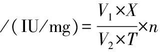 式中:V1,酶促反应体系的最终体积,mL;X,根据标准曲线计算出的消耗的阿魏酸的含量,mmol/L;V2,所加纯化酶液的量,mL;T,酶促反应时间,min;n,酶液的稀释倍数。